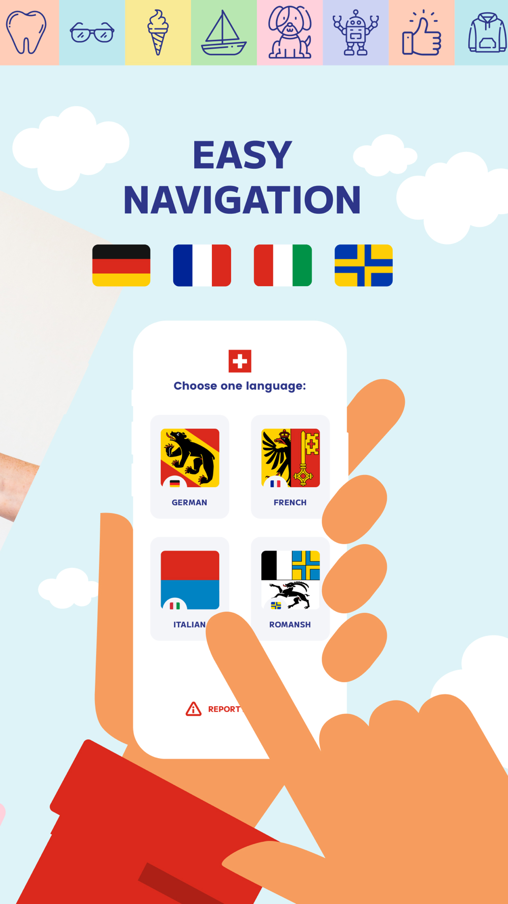 Playful Swiss language learning for kids! Explore German, French, Italian, and Romansh through engaging games and colorful visuals.