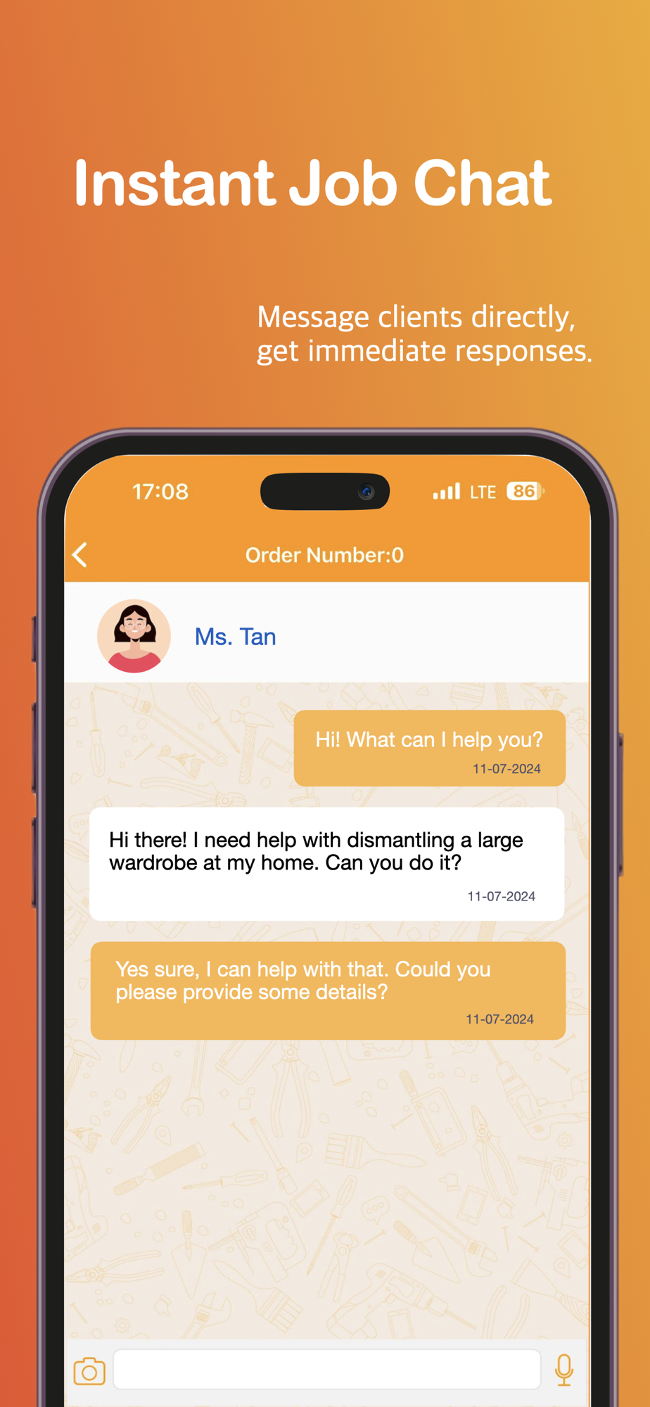 Customers place orders. Handymen take orders. Communicate and Start work — all managed digitally without manual filtering.