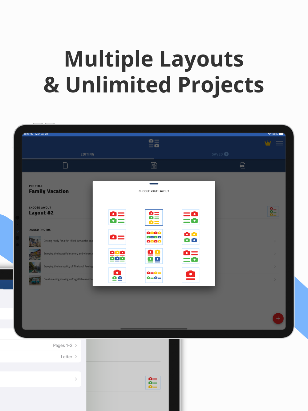 Choose from a wide selection of grid layouts and easily add photos from your camera or gallery. Customize each image with a personal or professional description. In just a few taps, generate a high-quality PDF document that you can share, print, or archive. Perfect for photo journals, catalogs, presentations, and more.