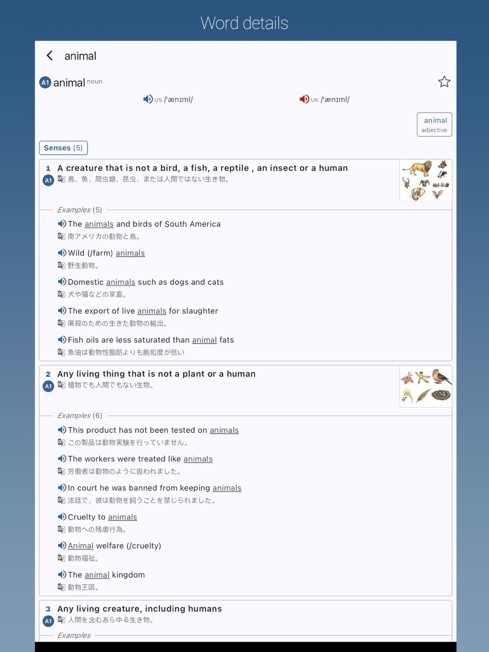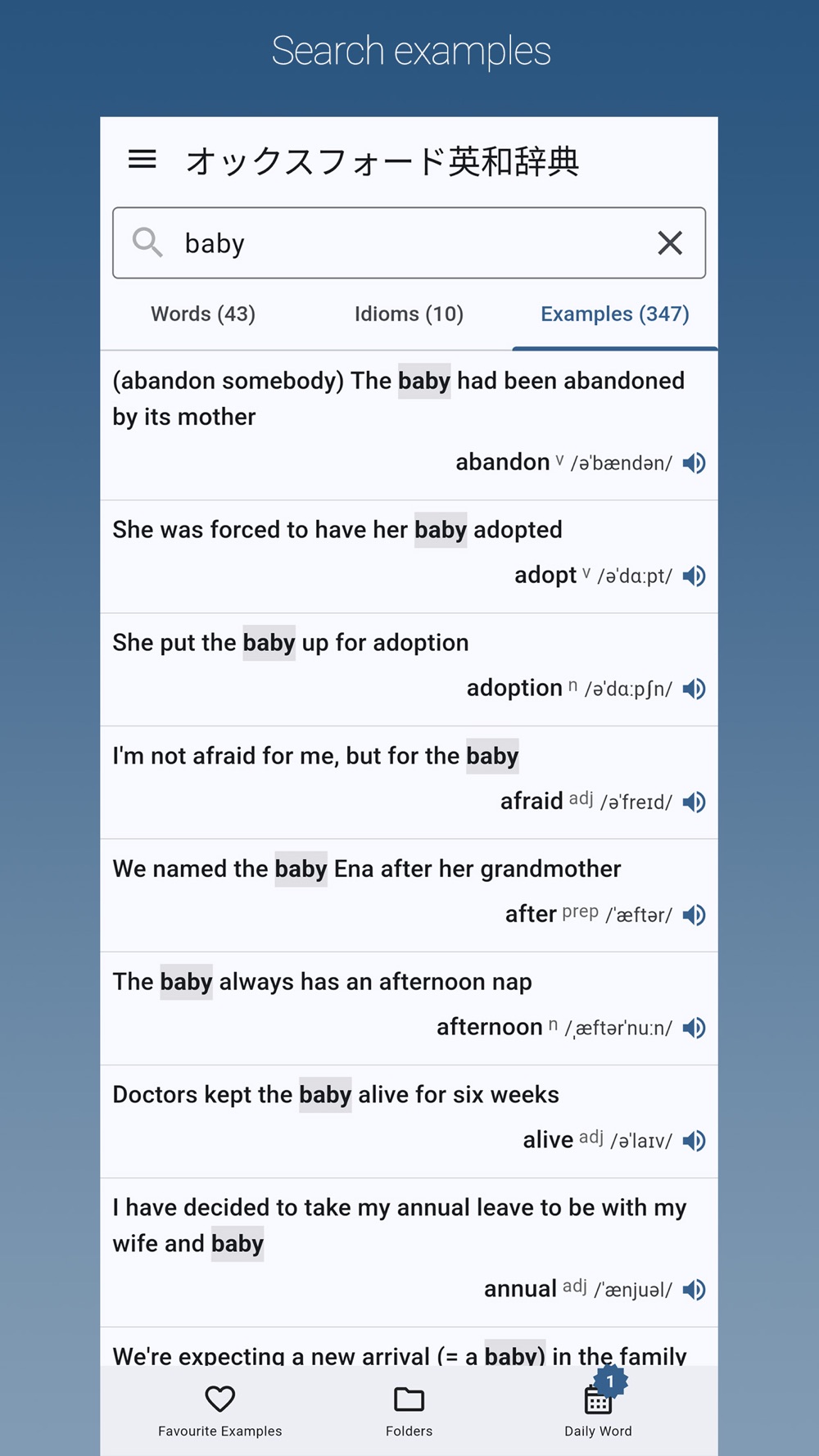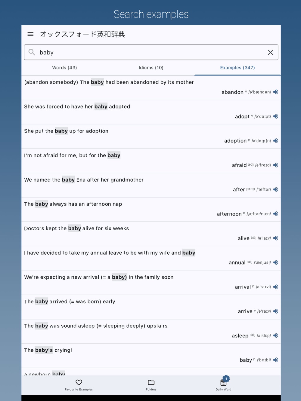 Favorite Examples: You can save your favorite examples to view, listen to again, or quickly access the word of each example.