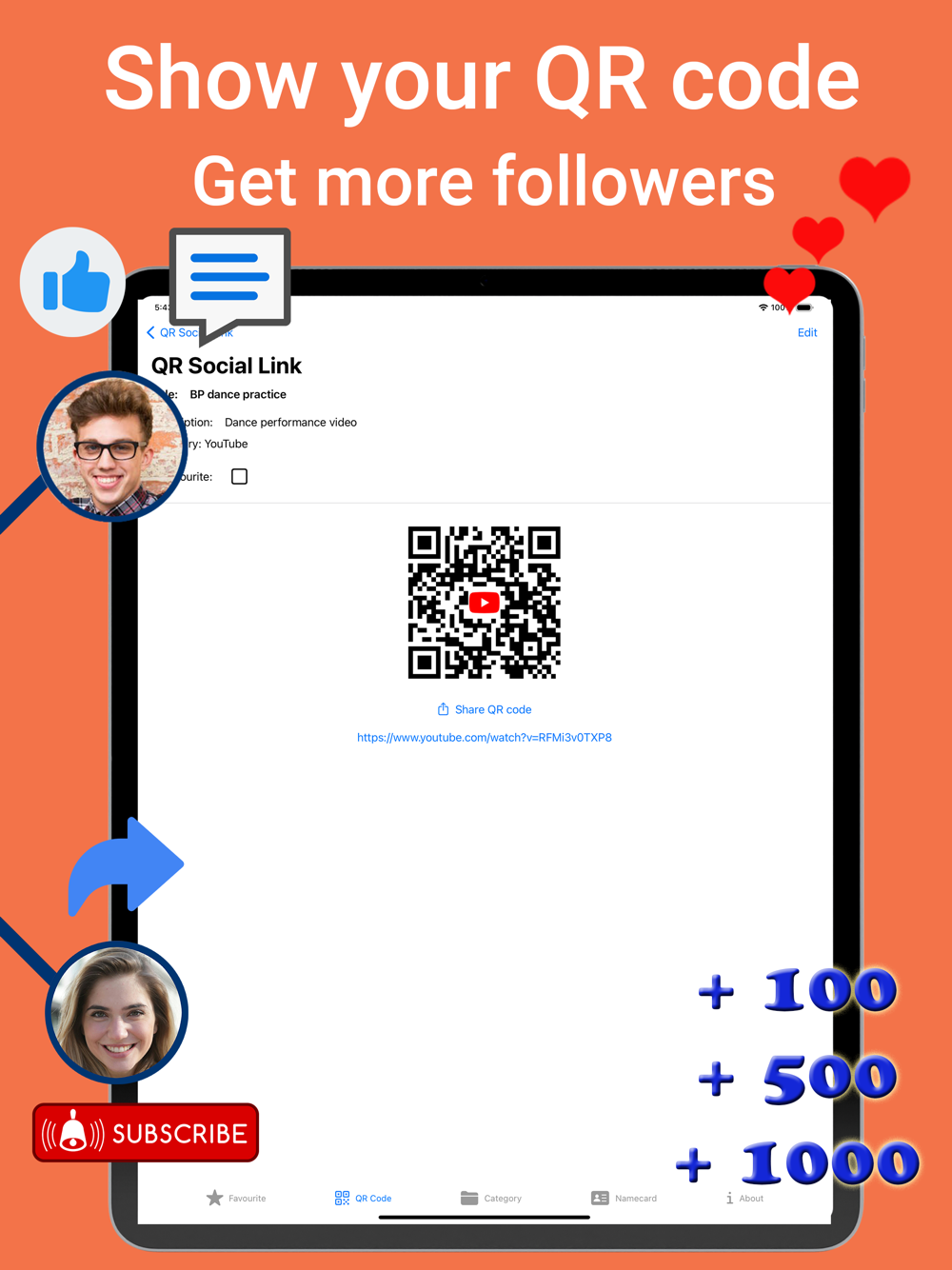 Generate and store QR codes for your social media URL link, or your web store page link. Organize them in different categories like contact list. In addition, this app can also generate QR code for your phone contact (vCard).