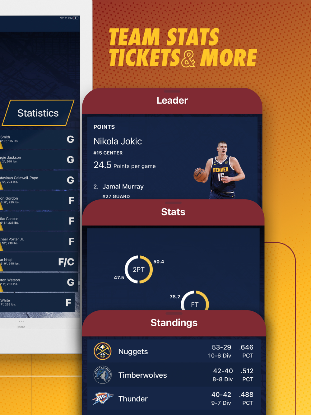 This is the official mobile app of the Denver Nuggets. It delivers an unrivaled interactive team experience by providing the most up-to-date scores, schedules, news, and stats.