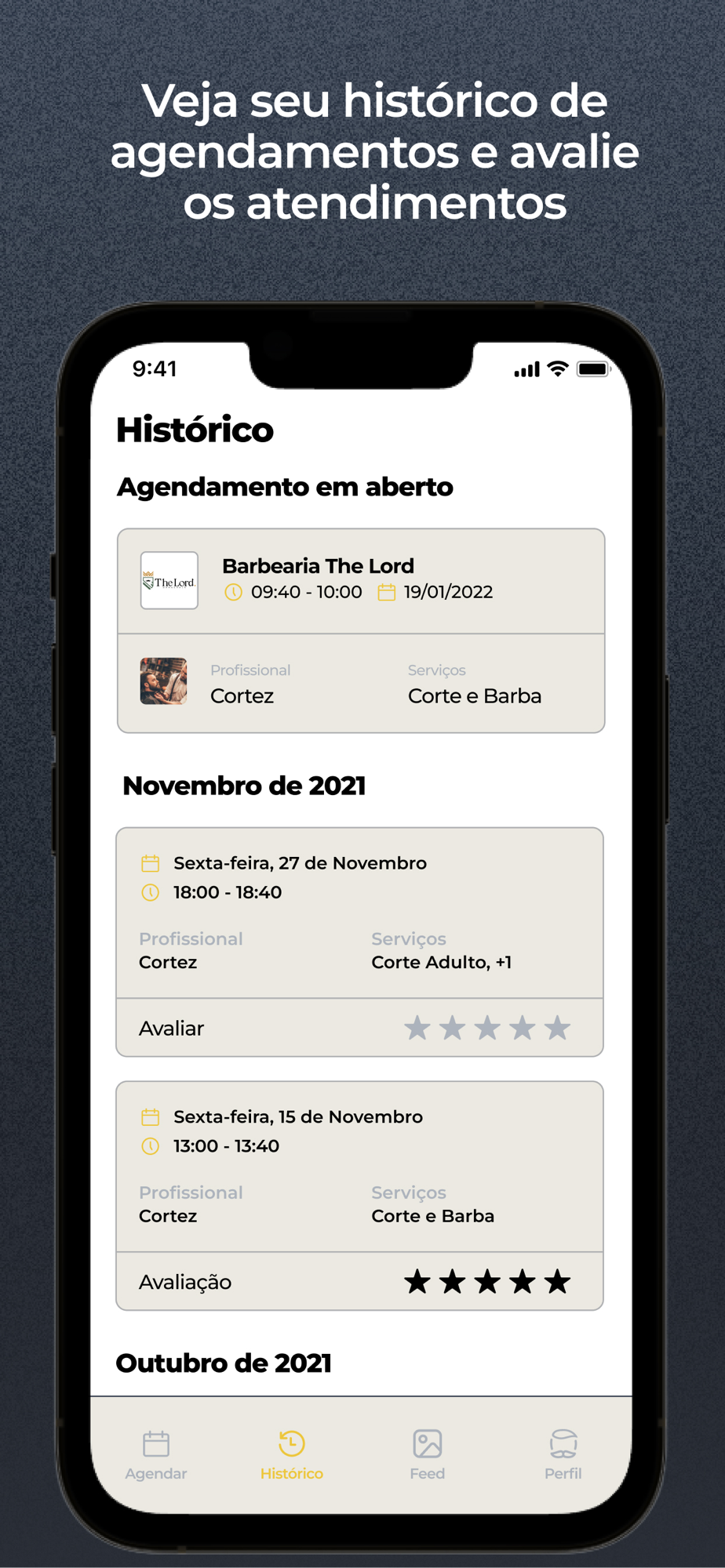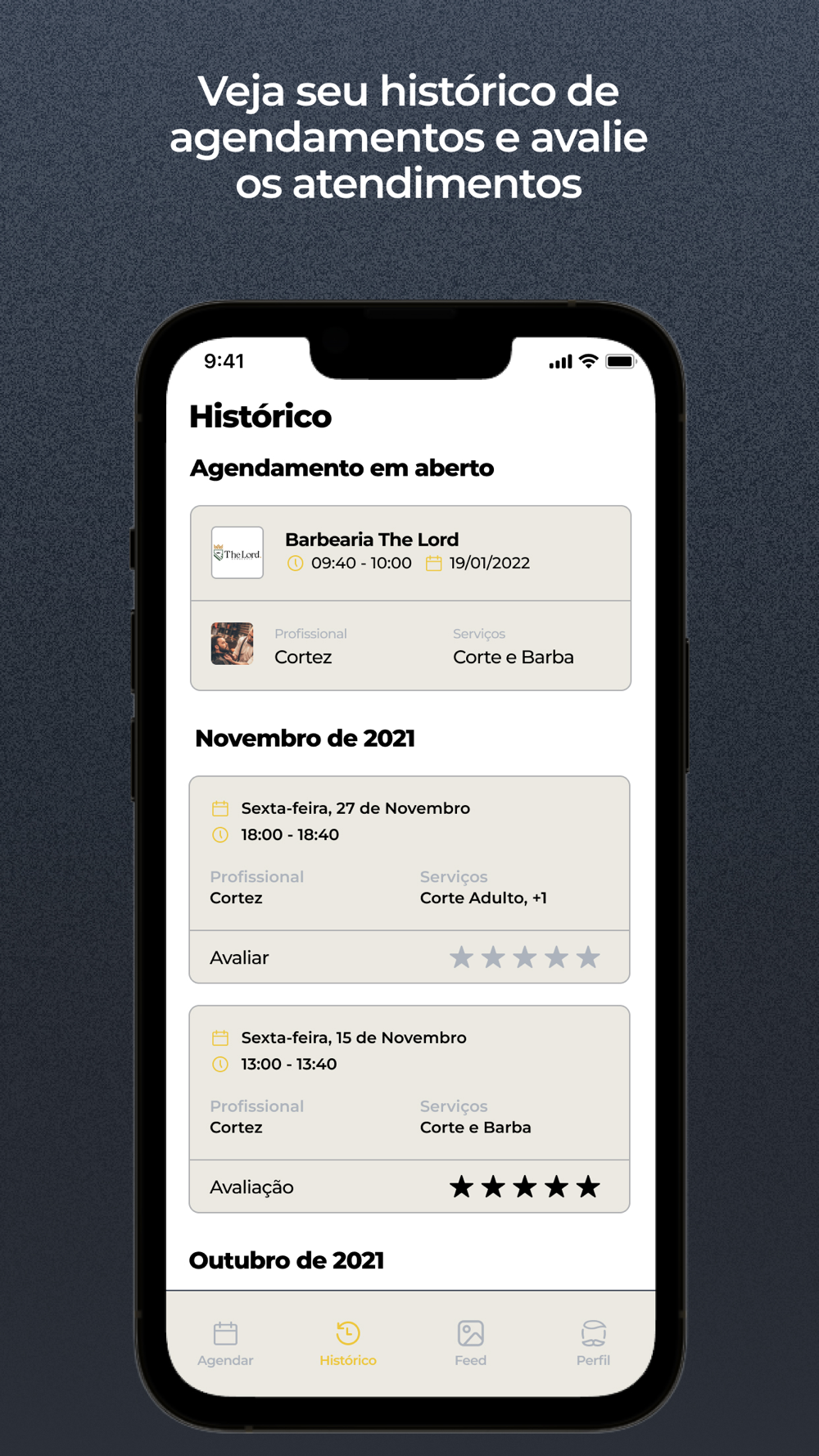 Através do App Barbearia The Lord os clientes podem realizar seus agendamentos de uma forma muito mais prática. Na tela inicial, é possível selecionar os serviços e horário desejado para seu próximo atendimento. Já na tela de histórico, você poderá avaliar como foi o seu atendimento, remarcar ou cancelar seus agendamentos. É possível também na tela do perfil o cliente editar suas informações, como e-mail, foto de perfil e telefone.