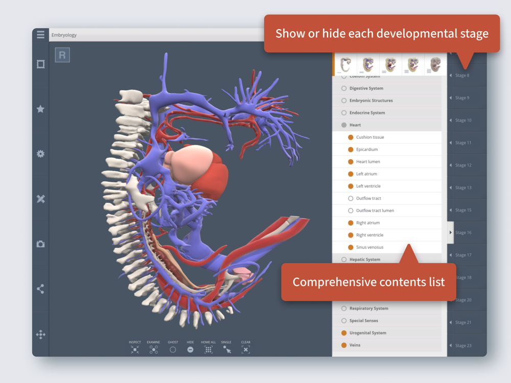 • The Contents folders arrange 300+ structures systemically, meaning you can browse by subcategory and switch all related structures on at once. It provides an excellent learning tool – for example, you can turn on all the developing structures of the brain or select all of the structures which contribute to the ear.