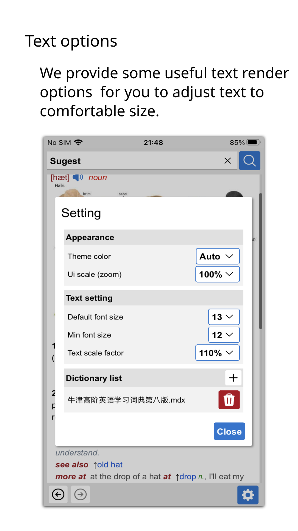 3. Umfassende Wörterbuchformatunterstützung: Dieses App unterstützt derzeit Wörterbuchformate wie ZIM, MDX und DSL. Auf dem Internet gibt es derzeit viele Wörterbücher, die Sie suchen und herunterladen können, und es gibt auch einige Tools, die zum Erstellen eigener Wörterbücher verwendet werden können.