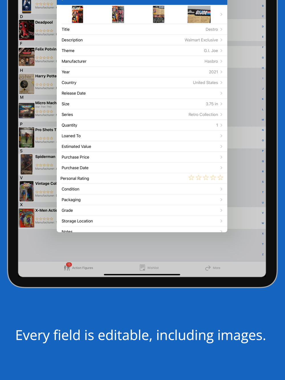 • Personal details per action figure including Loaned, Purchase Price, Purchase Date, Date Added, Personal Rating, Last Read, Storage Location, Notes, Estimated Value, and more.