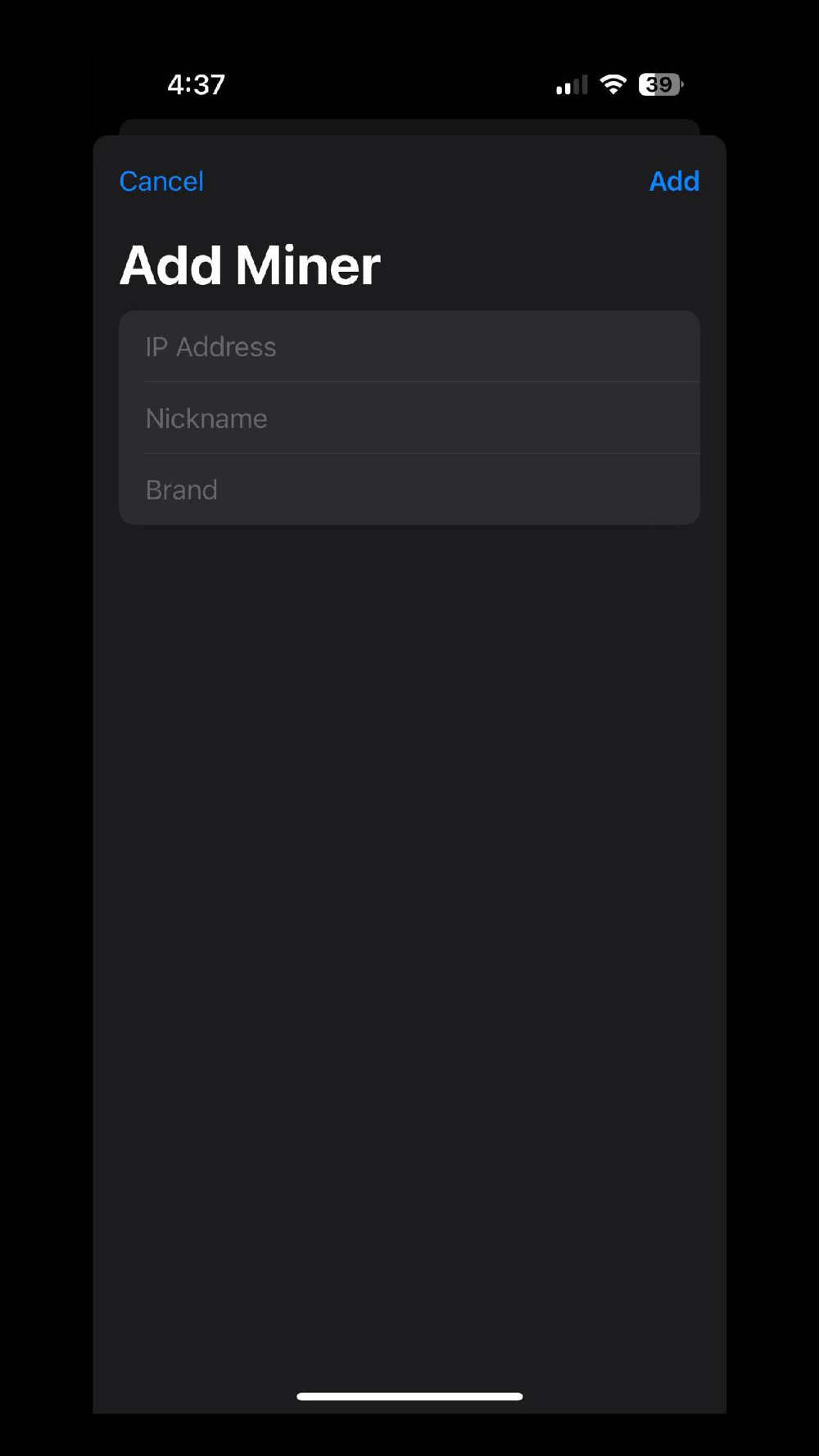 -Adding Mining hardware: Users can add new mining hardware by specifying their local IP address, nickname, and brand.