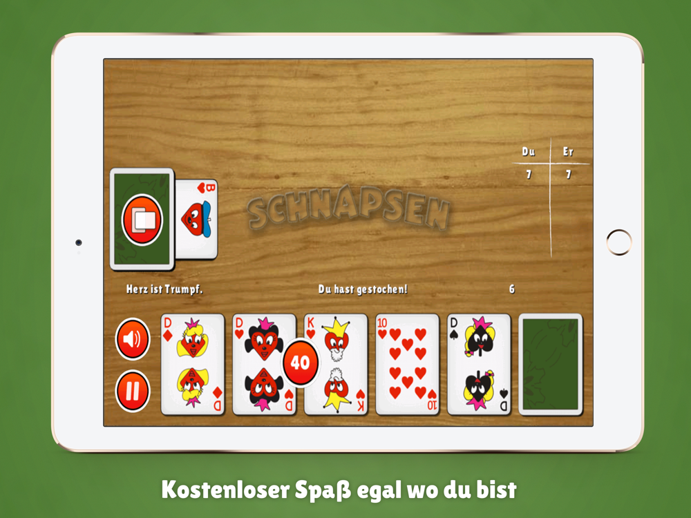 - Wir sind ganz nebenbei auch die graphisch schönste Schnapsen-App der Welt. 4 verschiedene Kartendecks von Comic über Doppeldeutsch bis zu Riesensymbolen für den kurzsichtigen Kartenspieler und 4 verschiedene Hintergründe von der Wiese bis zum Beisl machen Schnapsen zu einem hübschen und vielseitigen Erlebnis.