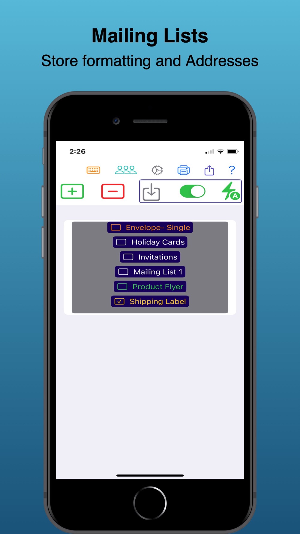Mailing Lists store all of your settings so in subsequent uses all you have to do it select the mailing list and print it. Create mailing lists from your contact groups with a touch off a button; or, simply type the name.