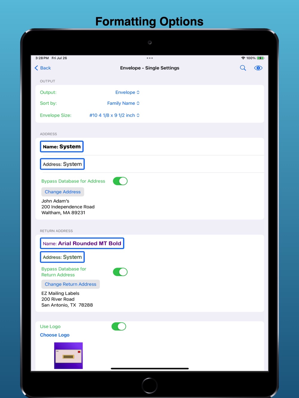 Create one-off shipping labels or envelopes by using the bypass database button where you can simply type the address and/or return address.
