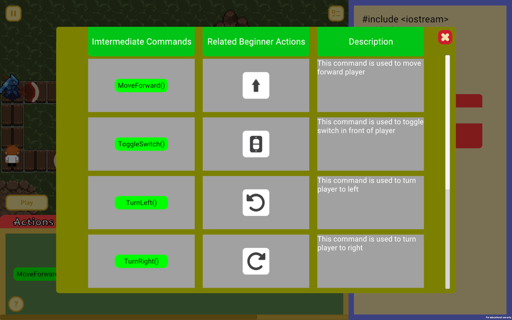 - Intermediate Mode: Introduction to C++ syntax, practice and memorize the syntax through more challenging puzzles.