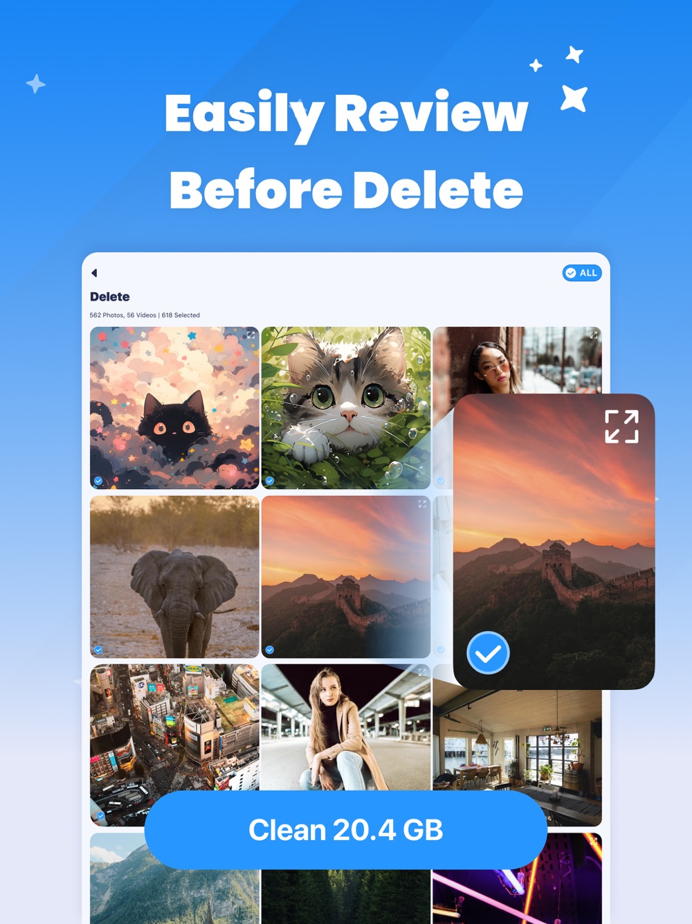 Save time with our batch cleaning feature. Select multiple photos and videos to delete all at once, making the cleanup storage process quicker and more efficient.