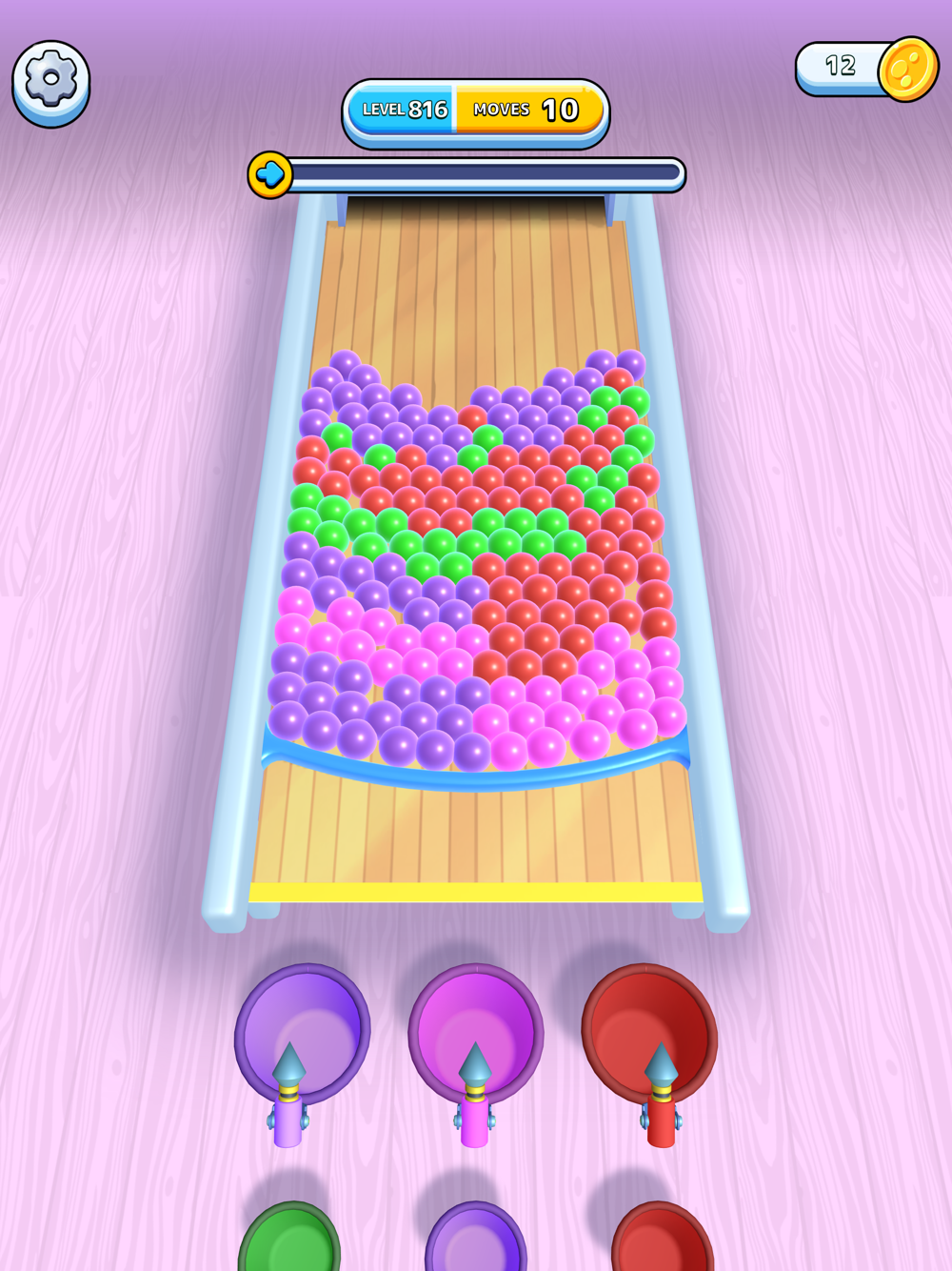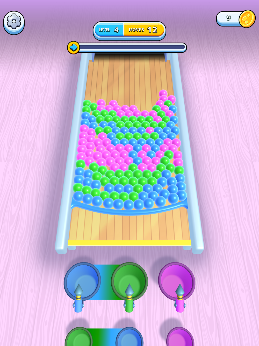 Strategic Gameplay: Pull balls into buckets in the correct order to progress.