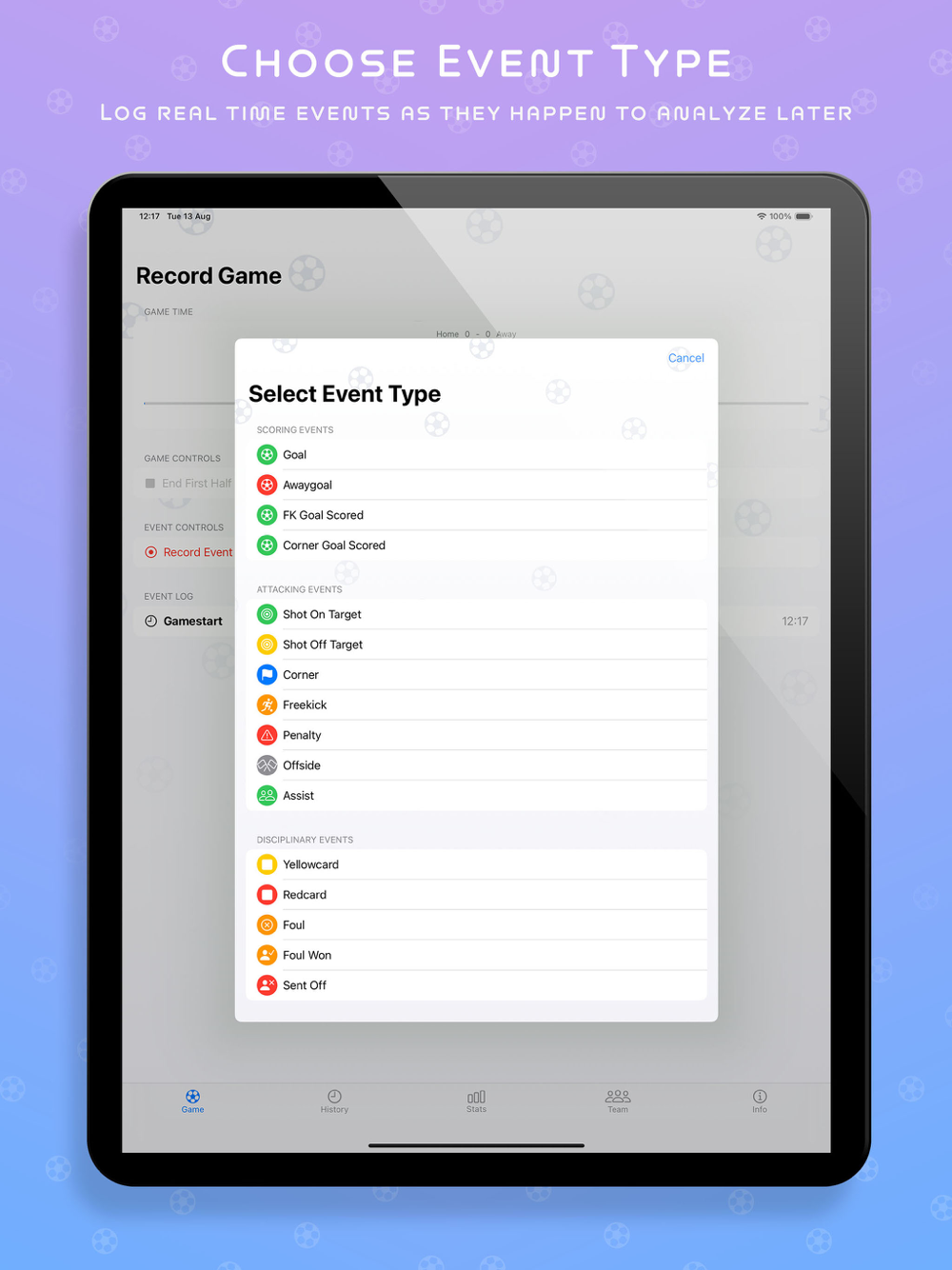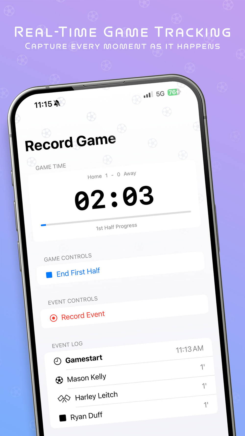 • Record goals, assists, cards, substitutions, and more