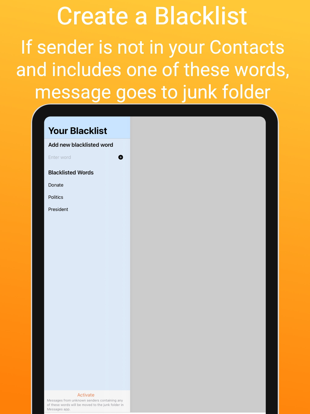 - **Customizable Blacklist:** Create a personalized list of words you want to filter out. If a message from an unknown sender (ie, not in your Contacts) contains any of these words, it will be automatically categorized as Junk.