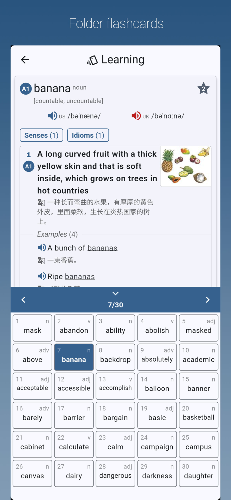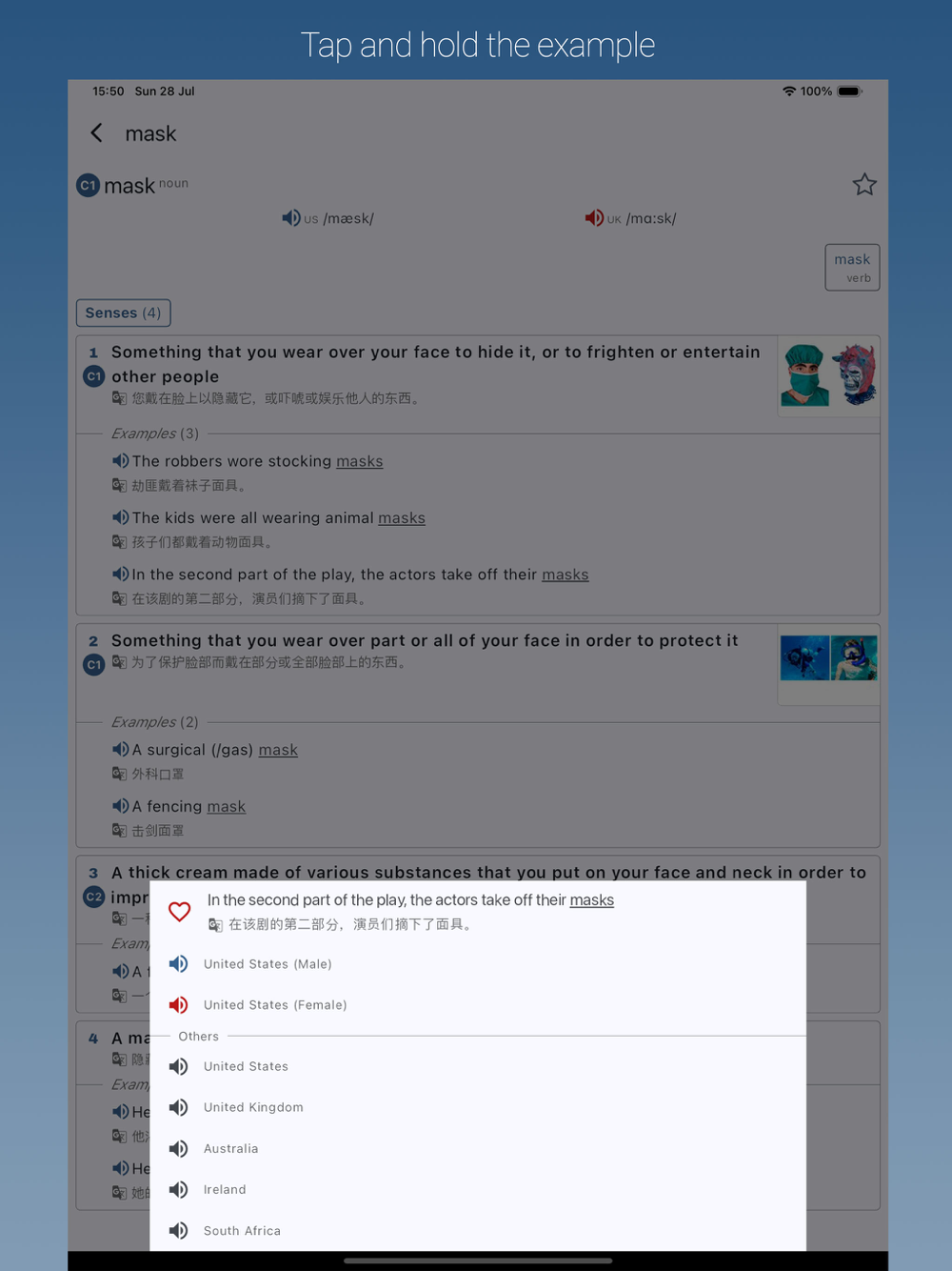 Favorite Examples: You can save your favorite examples to view, listen to again, or quickly access the word of each example.