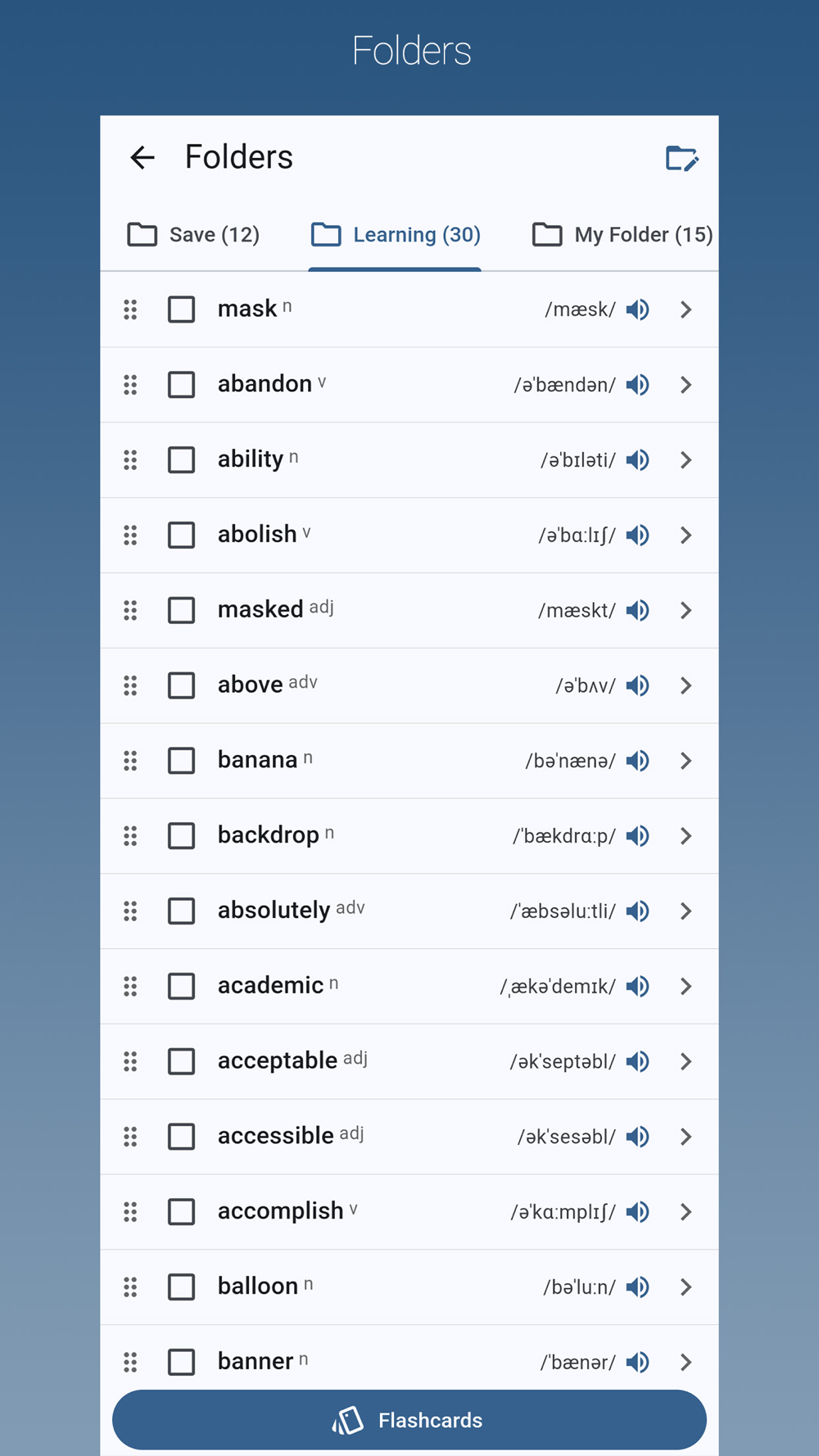 Folders: You can create folders and name them as you like and add the words you want for quick review.