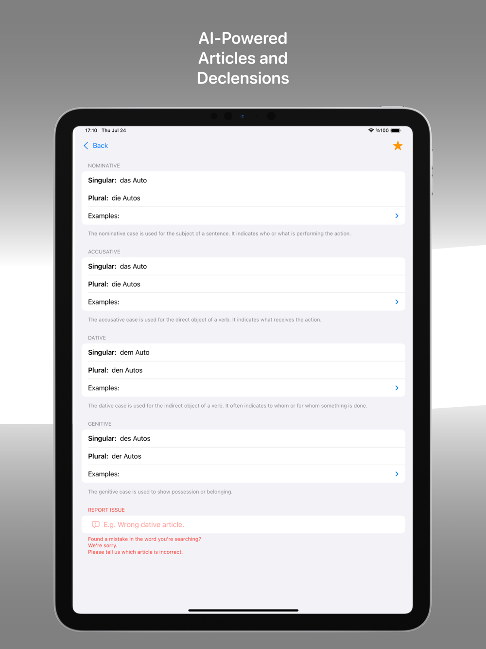 This app makes it easier to learn the articles (der, die, das) of German nouns. Thanks to AI, example sentences are automatically generated for each word.