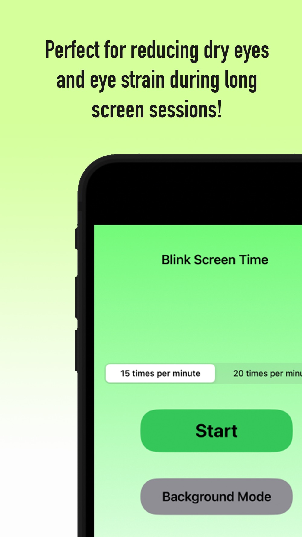 Blink Screen Time is a simple and effective app to remind you to blink regularly while using your device. Customize the blink rate to 15 or 20 times per minute and adjust the volume of the gentle clicking reminder sound. Just press the start button to begin reminders and press it again to stop. Perfect for reducing dry eyes and eye strain during long screen sessions!