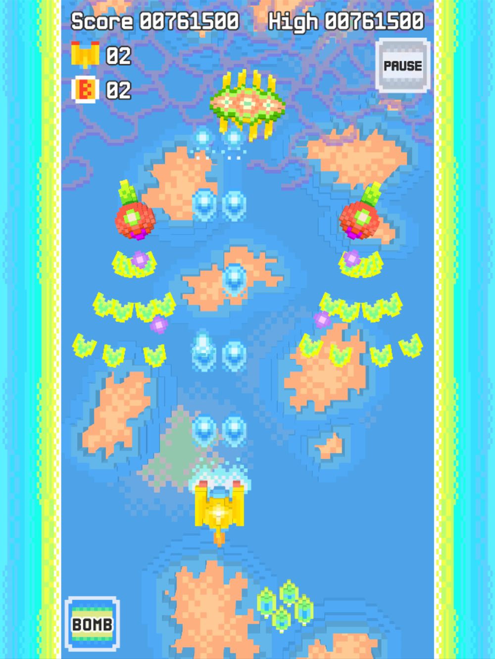 It is a simple vertical scrolling shooter that uses shots and bombs to attack.