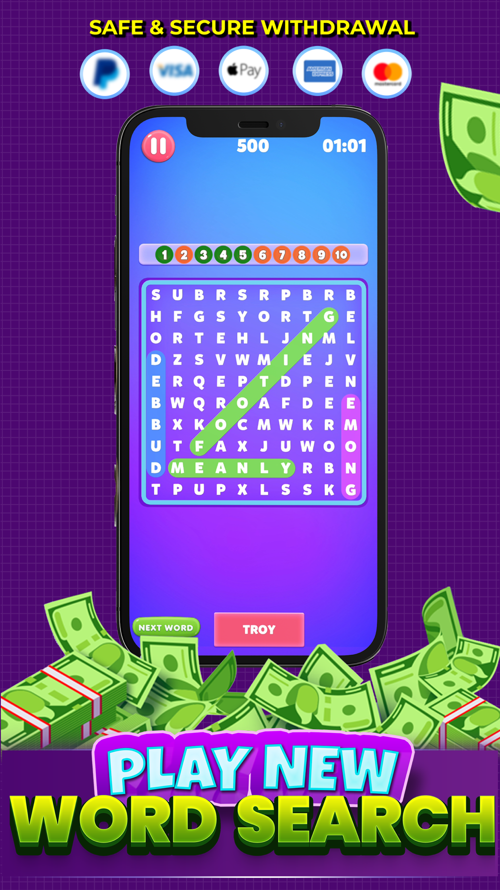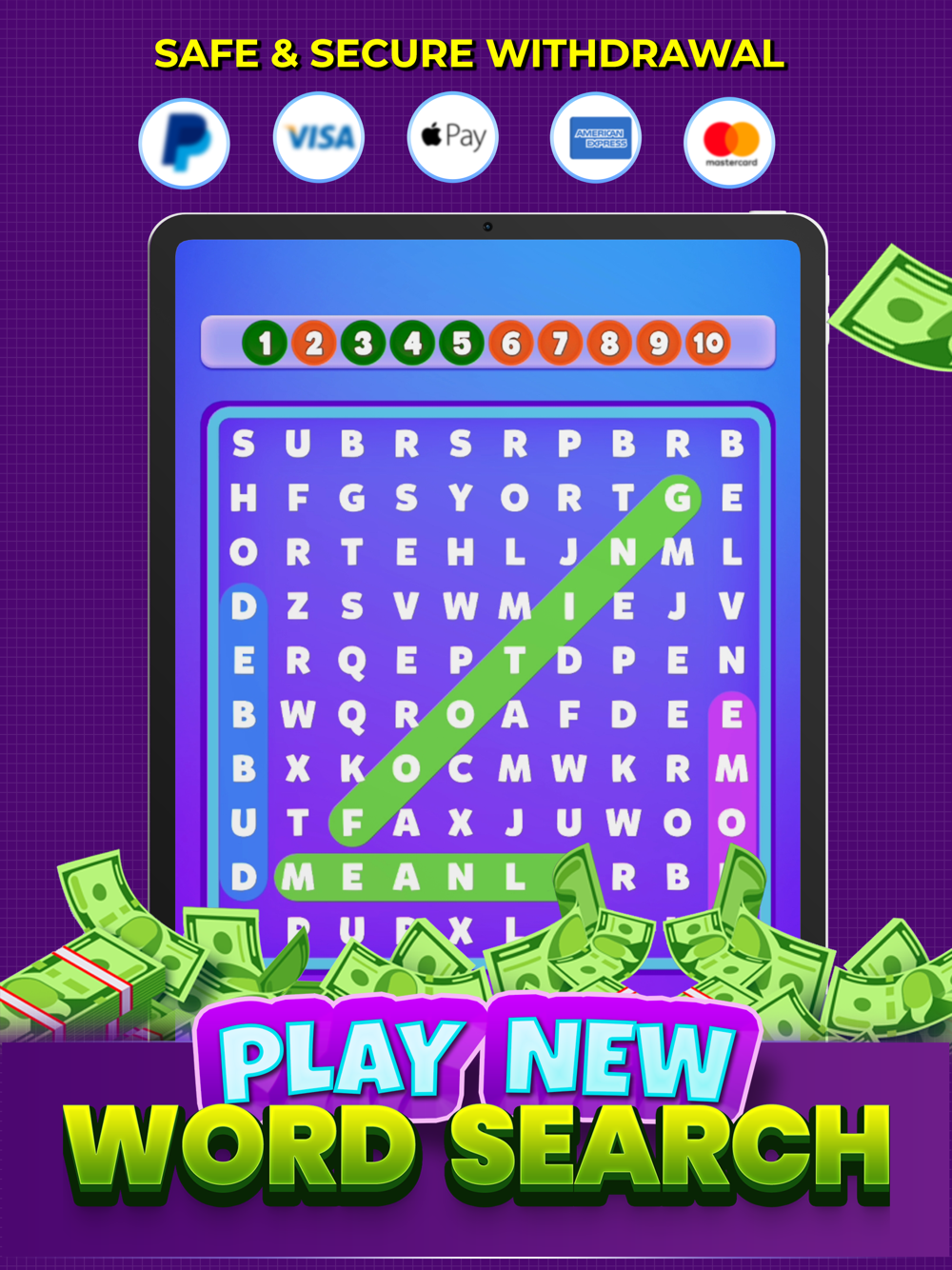 The goal is to search given words on the board by dragging and highlighting complete word.