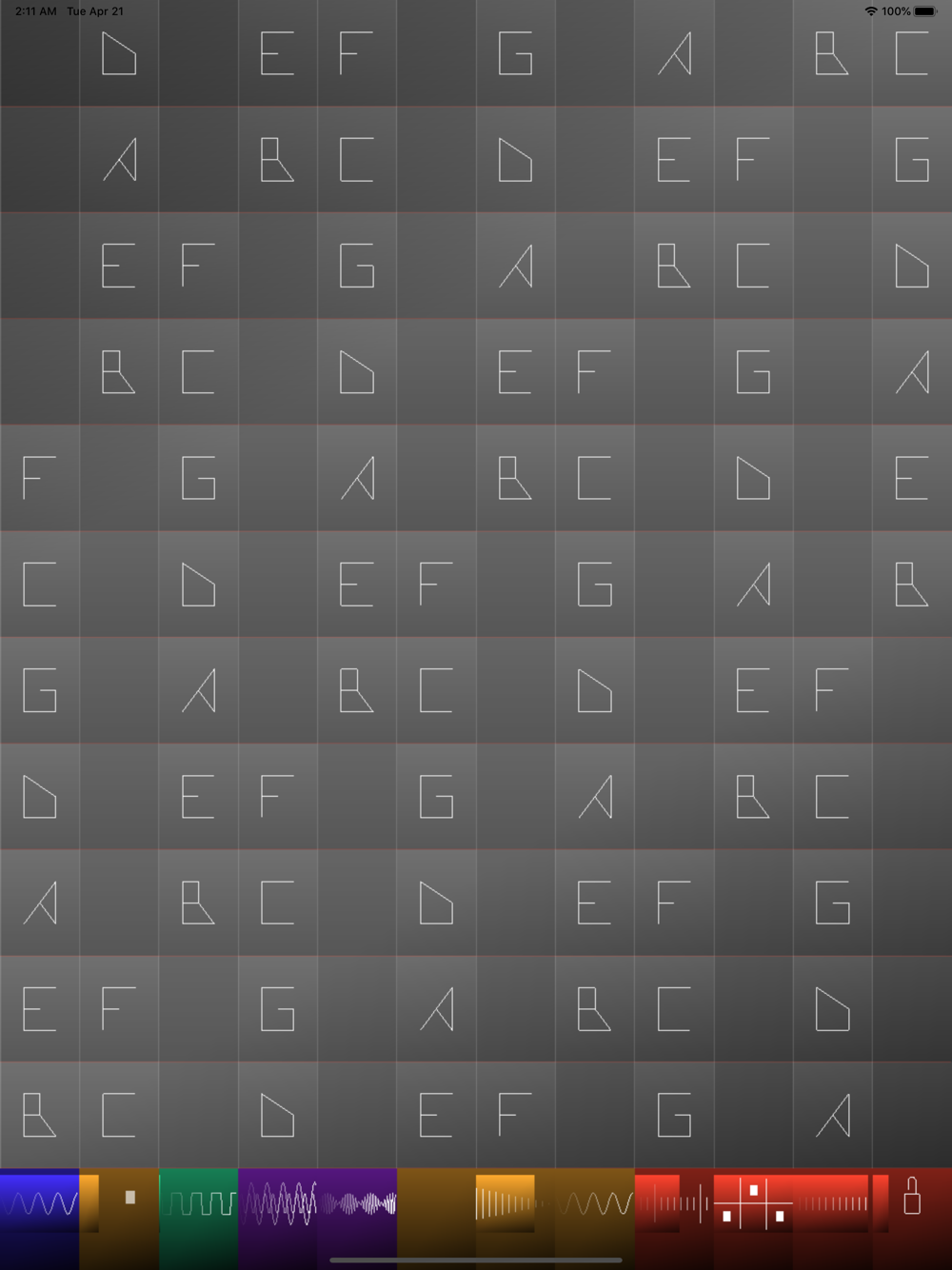 Экран iPad используется максимально полно, разделен на клавиши инструмента, каждая клавиша по горизонтали отличается на пол-тона(музыкальный интервал) от соседней.
