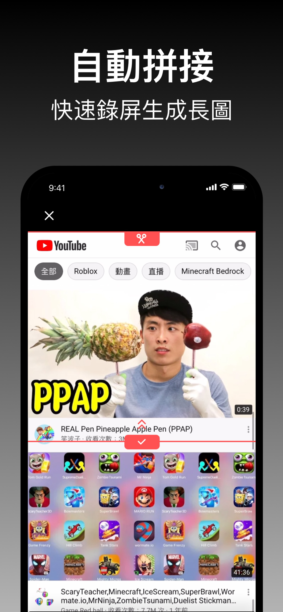 只需滾動錄影畫面或截取一些重疊的圖片,然後返回應用,長截圖App 就會自動識別它們並創建長截圖。