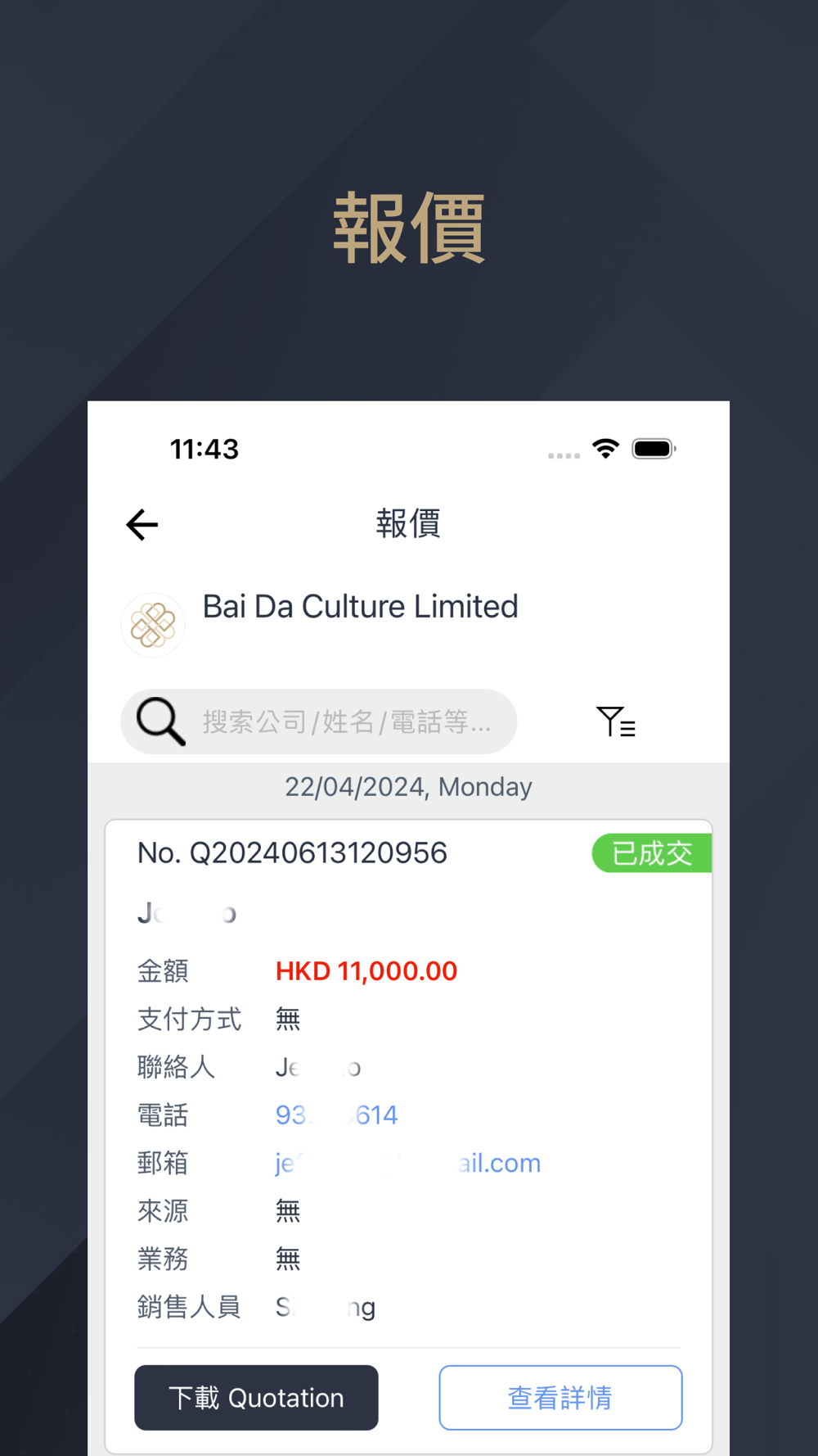 此app可助於企業在生意管理運作上,提供有效的幫助;可以管理客戶信息,快速查找客戶對接,並與客戶高效對接生意訂單,可以管理查看報價,發票等,並可以隨時查看分析生意數據。包括功能模組如下:
