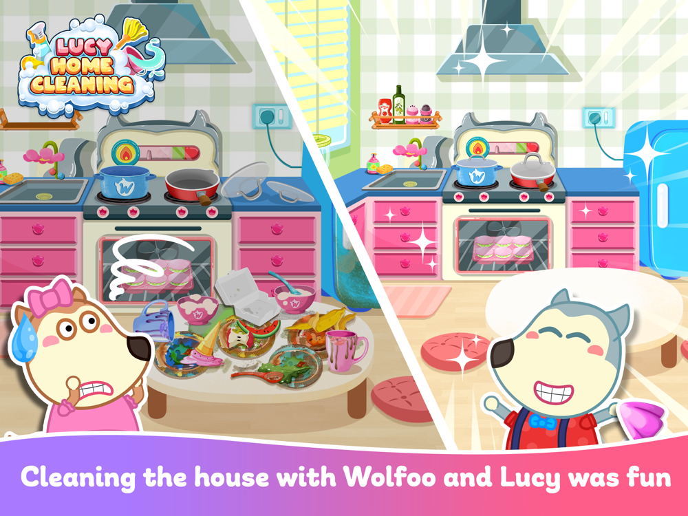 Play the cutest home cleaning game for kids with Lucy and Wolfoo: