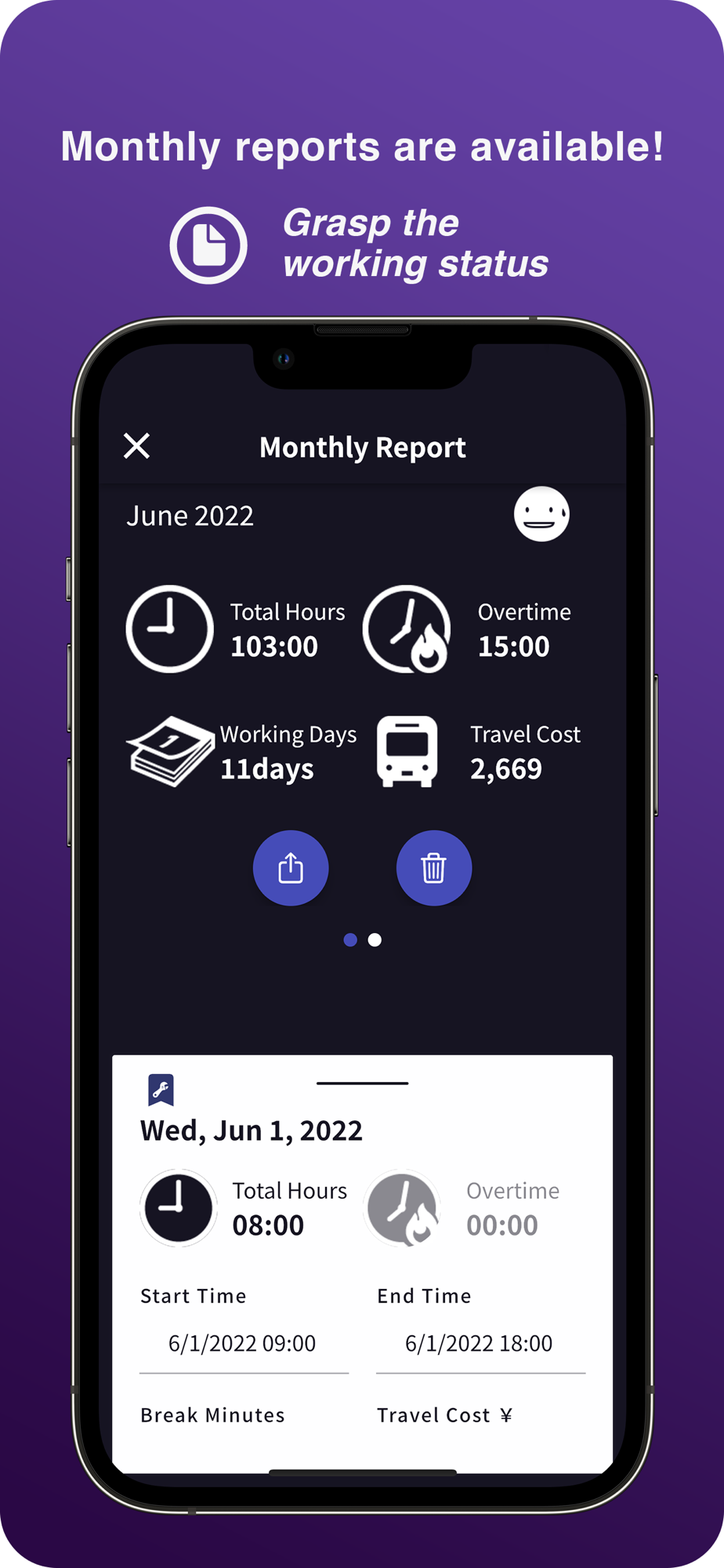 +Record and edit work arrival and departure times (at 1-minute intervals, record time stamped)