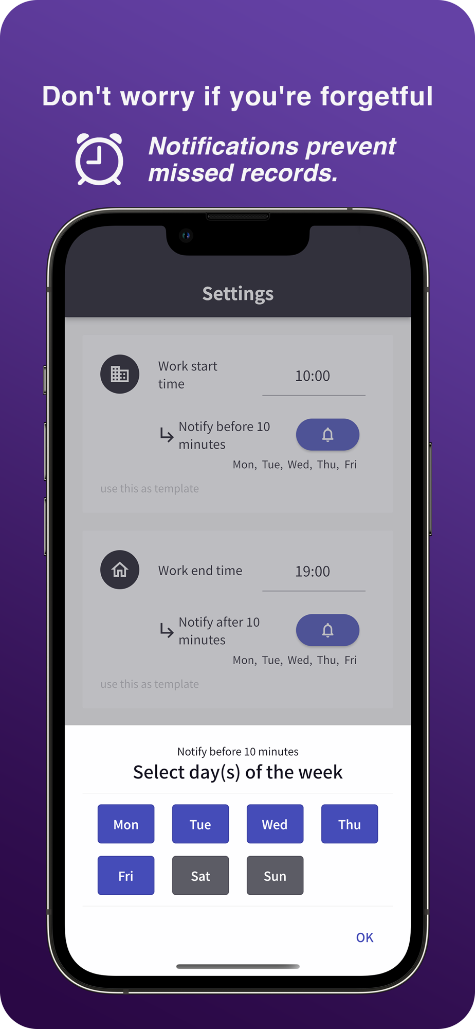 Also, the system notifies you 10 minutes before and 10 minutes after you clock in and clock out, so even if you are forgetful, you don't have to worry!