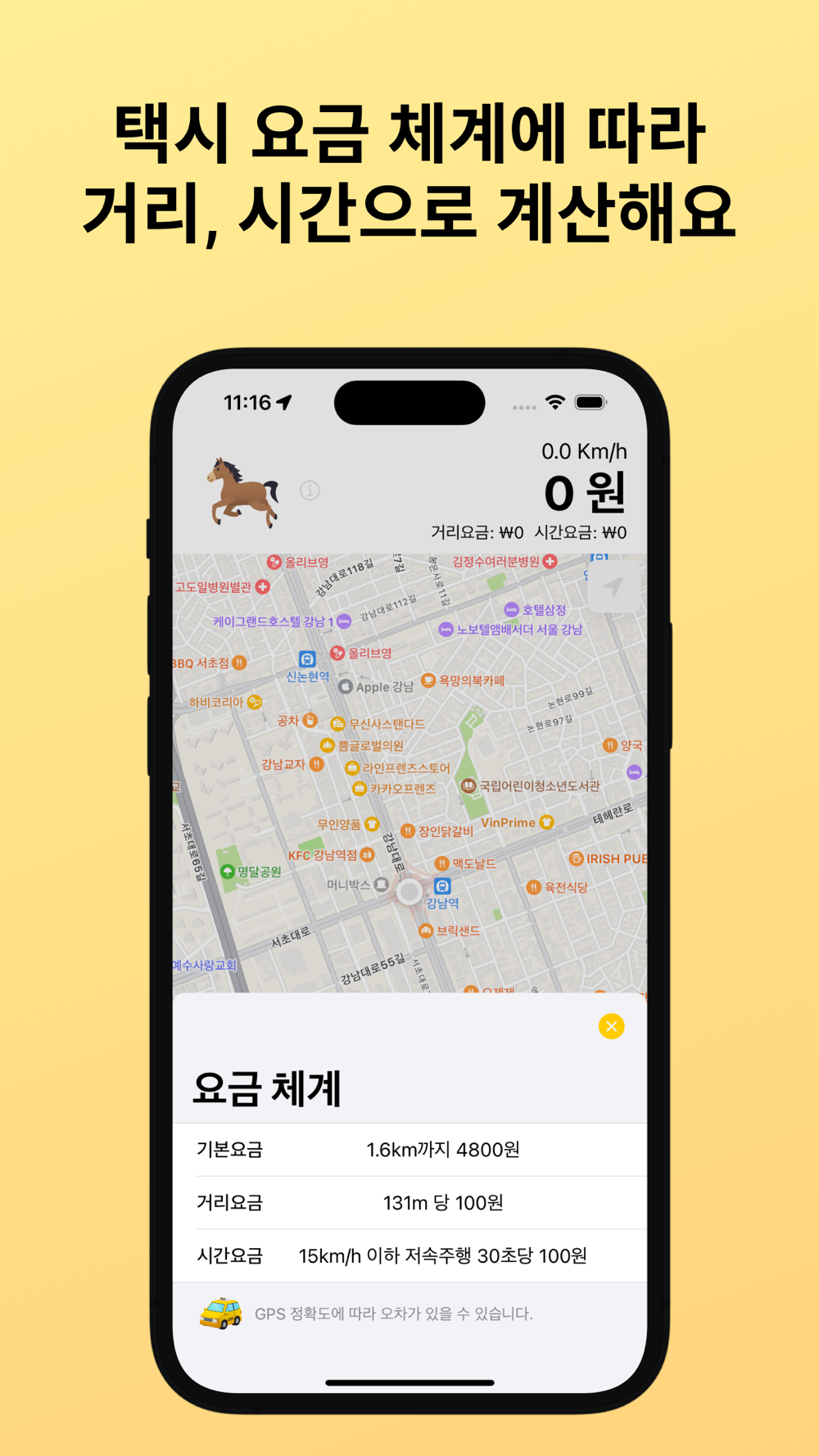 실제 요금과 차이가 발생할 수 있습니다. 실제 택시의 미터기는 바퀴가 굴러가는 것을 이용해 계산하므로 GPS 기반 앱을 이용해 계산한 요금과 차이가 있을 수 있습니다.