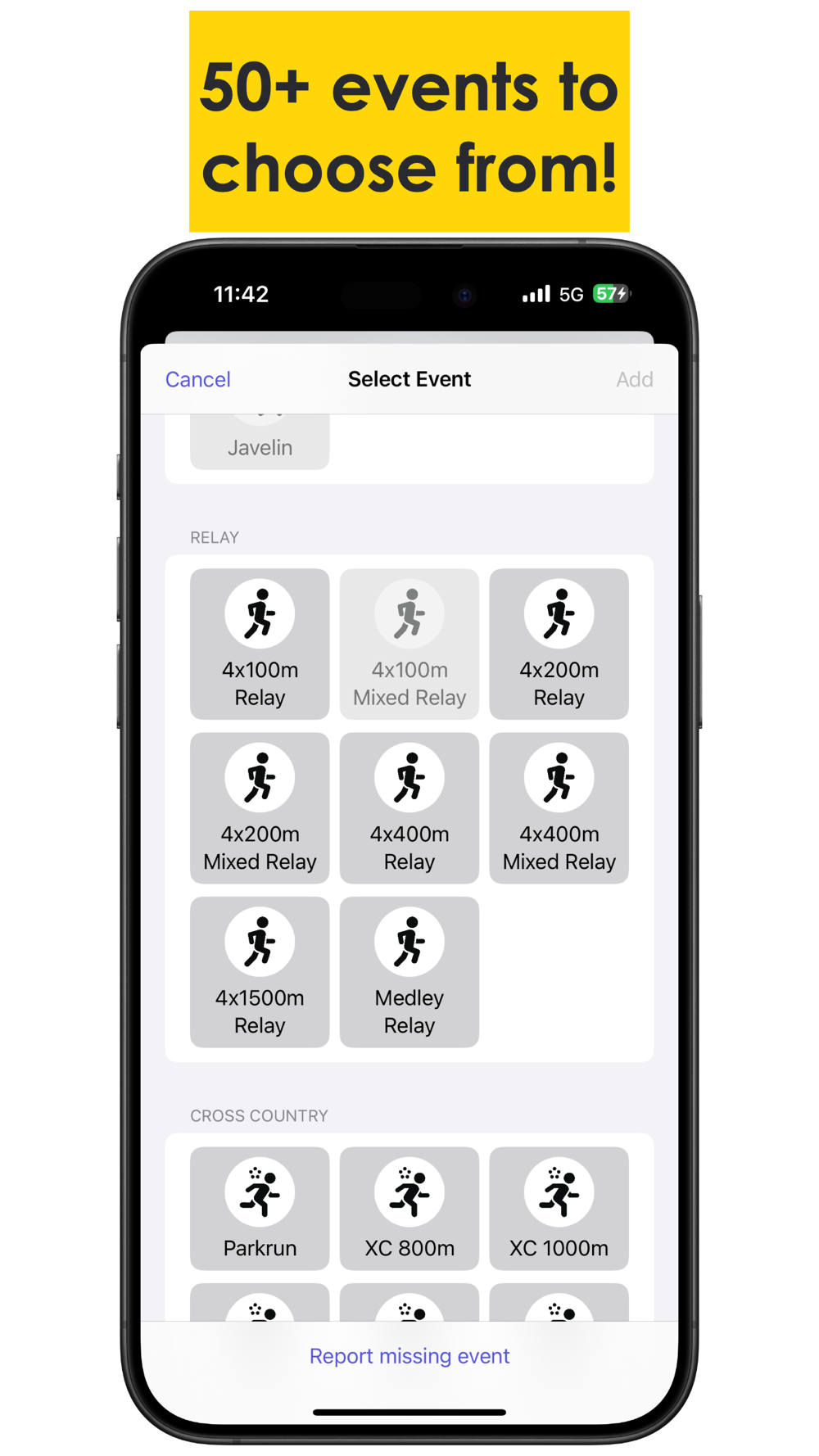 - Cross Country: Parkrun, 800m, 1000m, 1500m, 2000m, 2500m, 3000m, 3200m, 4000m, 5000m, 6000m, 8000m, 10000m