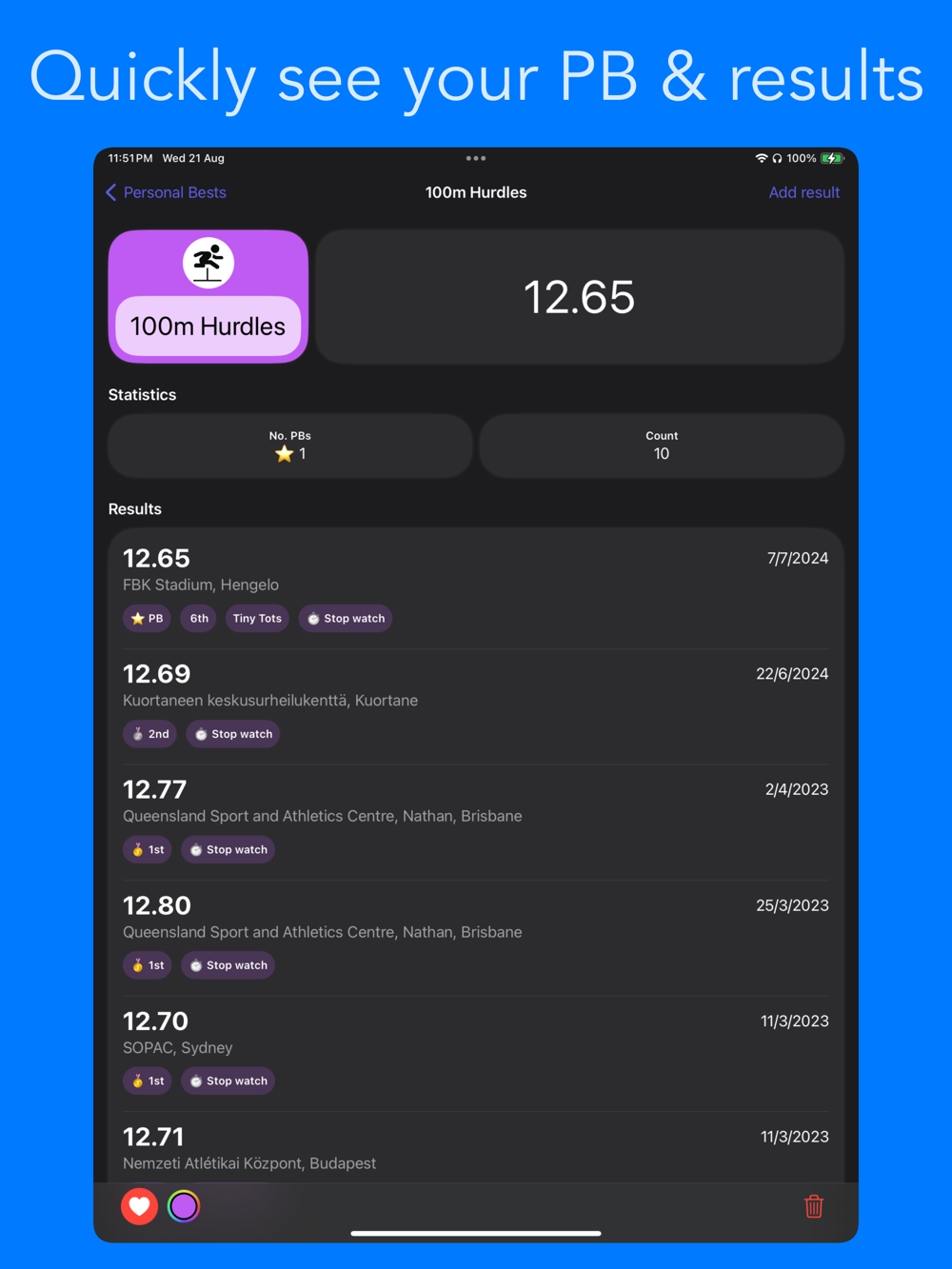 Whether you're chasing a new personal best or just keeping track of your athletic journey, PB Tracker is your essential tool for every track and field event. Stay organized, stay motivated, and stay on track!