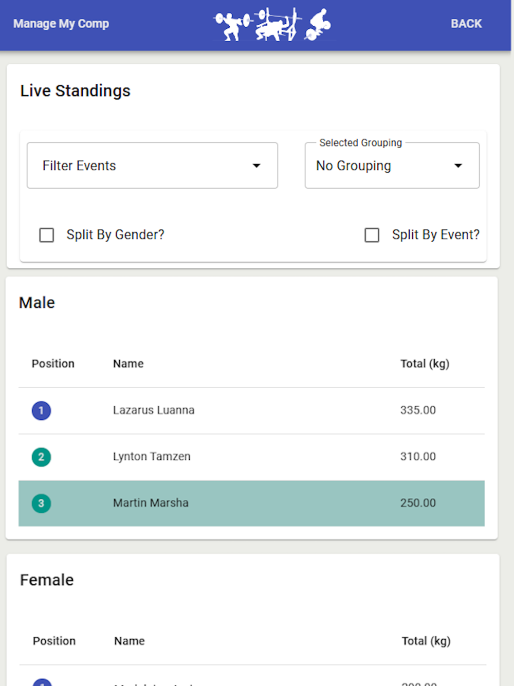 ManageMyComp.com is a suite of competition meet scoring software that drastically reduces the overhead of managing powerlifting, strongman and Olympic lifting competitions - from registering competitors to accessing the day's results.