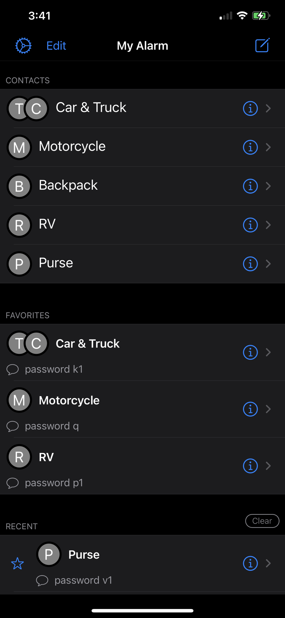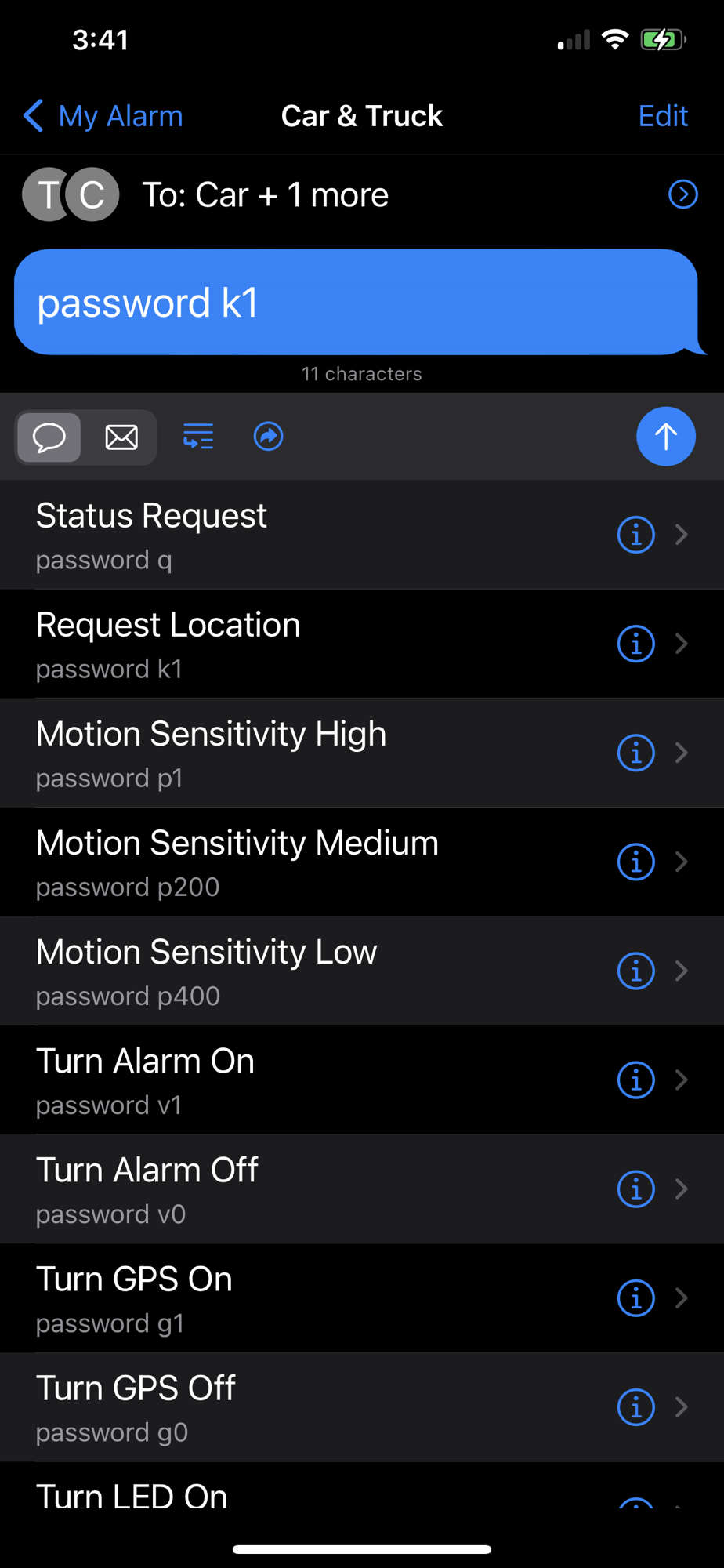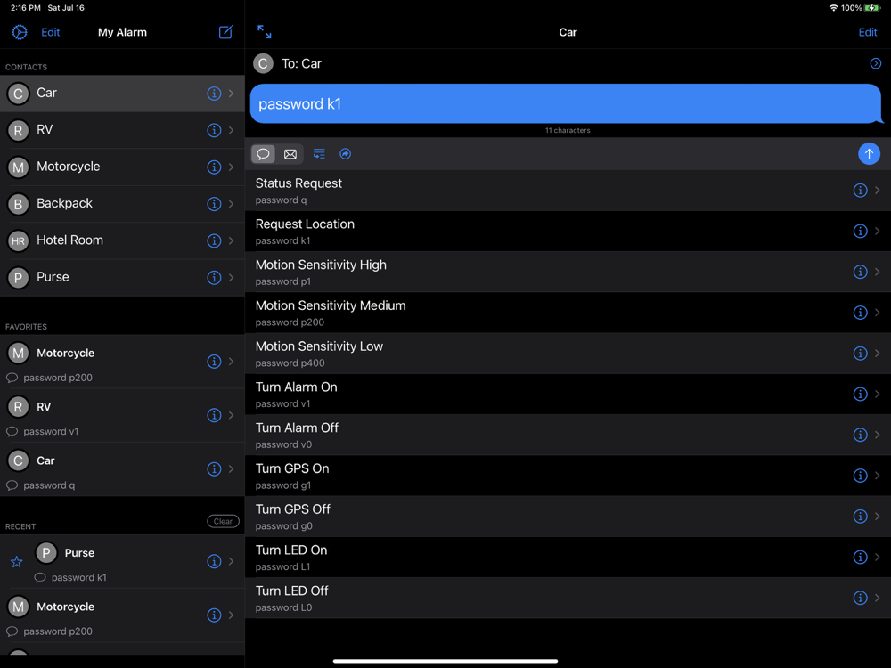 With the My-Alarm app you can organize your personal tracker contacts and commands so that with a couple of taps, you can compose a text message and control your tracker.