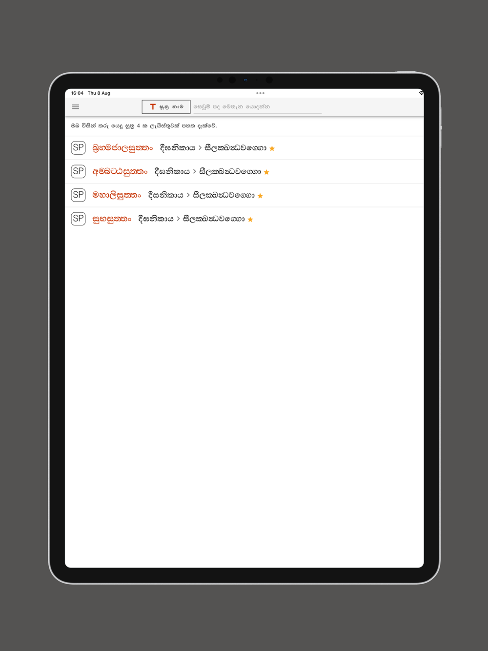 It provides the convenience of searching Sutta content, Sutta names, and the Pali-Sinhala dictionary. You can also navigate from the Sutta to its respective commentary, view relevant scanned pages, and bookmark your favorite Suttas for easy access.