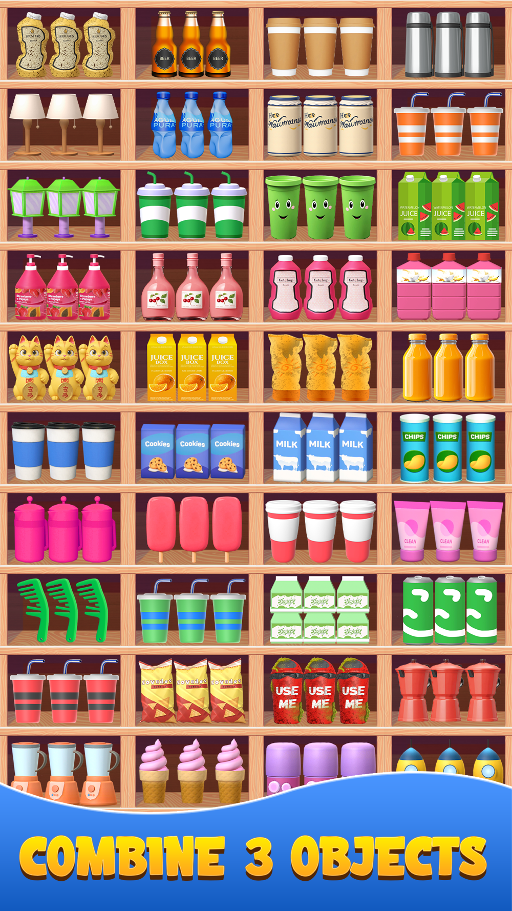 Sort & Match your goal is to create pairs of items and place them on the correct shelves. You will encounter a variety of objects including toys, bottles from different brands, accessories, cooking ingredients, and more. Each item has its designated spot!