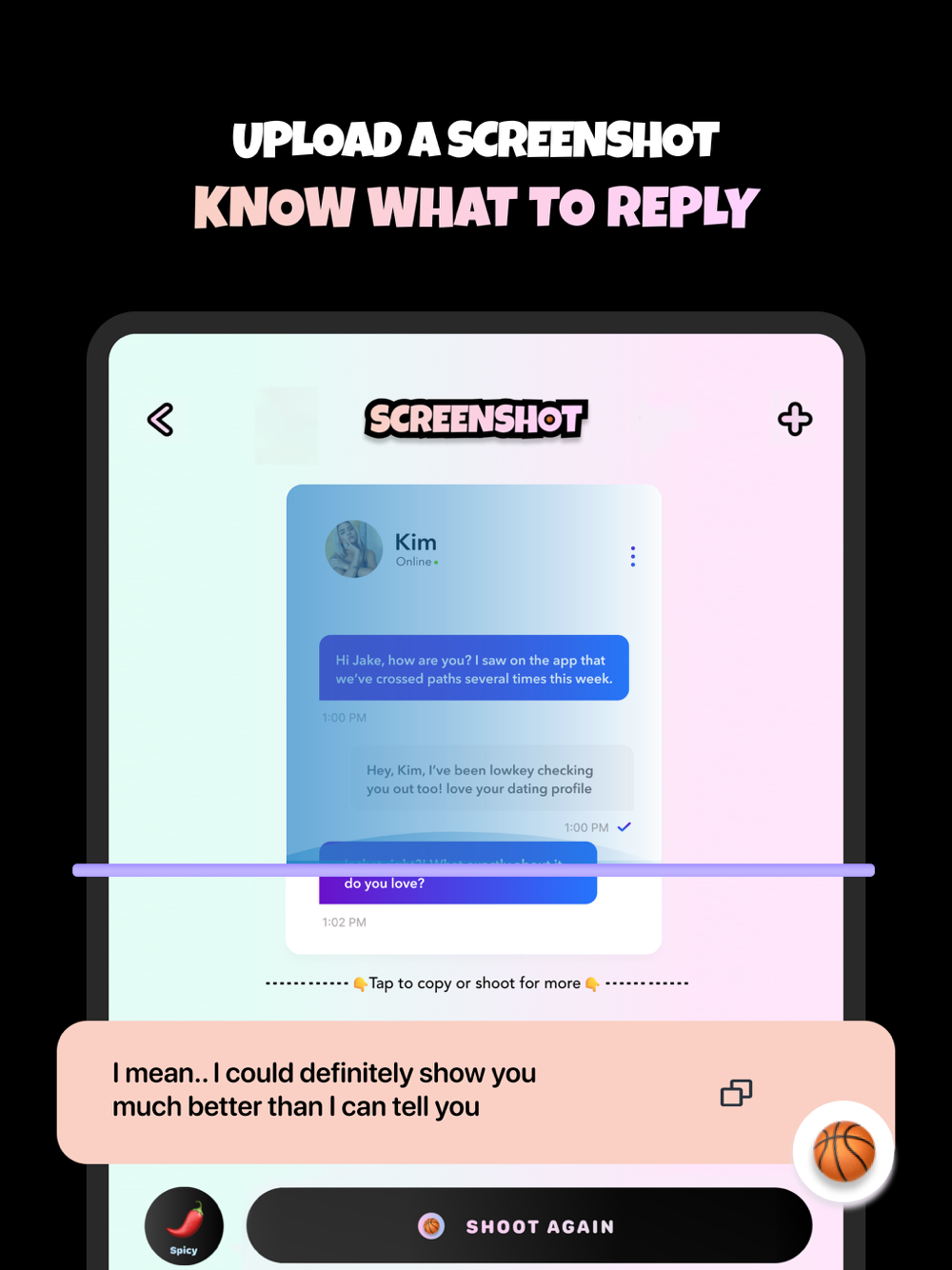 Whether you're sparking new conversations or keeping the flame alive, our app provides personalized responses based on your interaction style. Upload a conversation screenshot, and let Shoot Your Shot® Bot craft the perfect reply that resonates with real charm.
