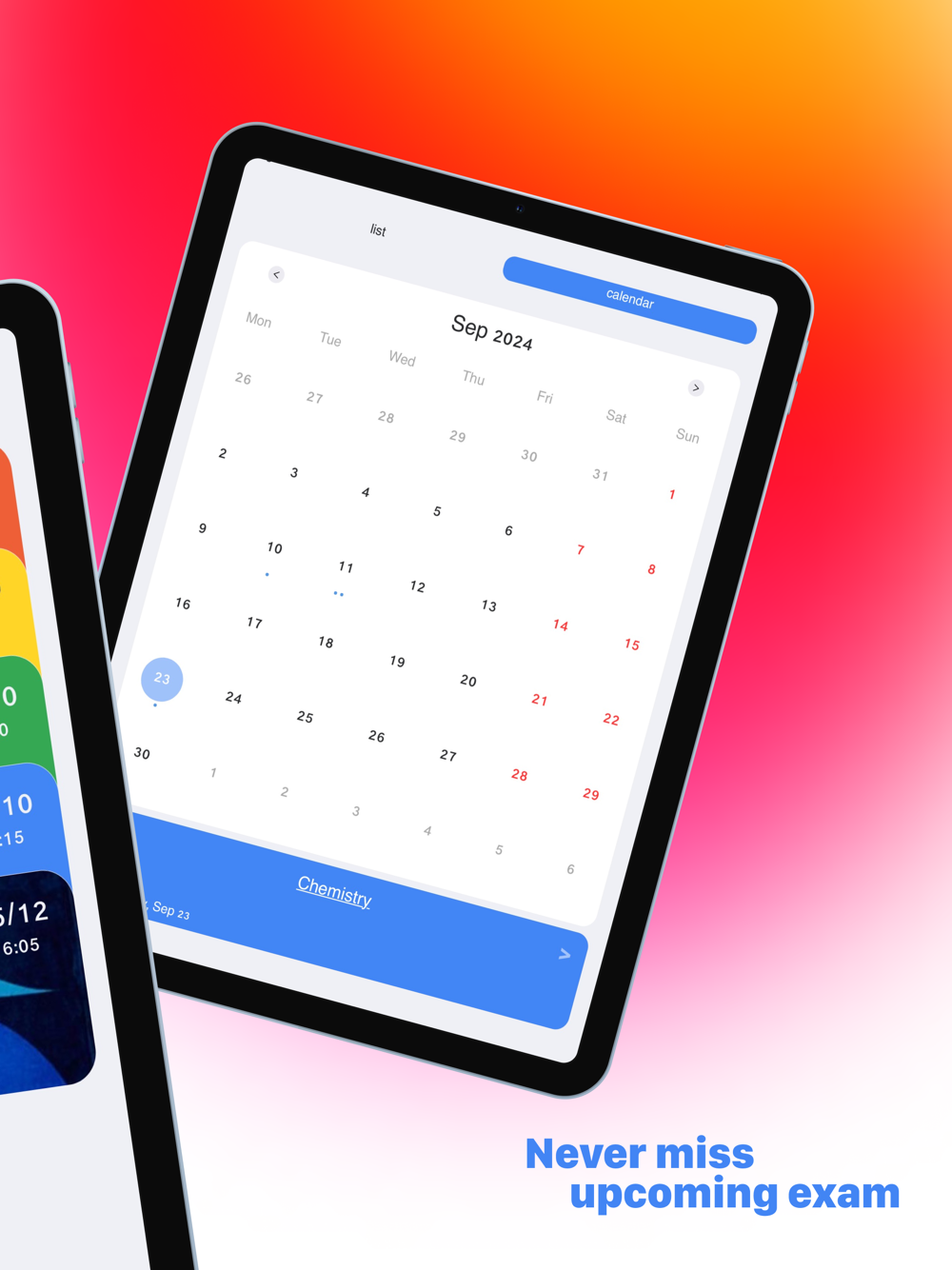 • List View: Easily manage your exam schedule with a clean and organized list of all your upcoming tests and work.