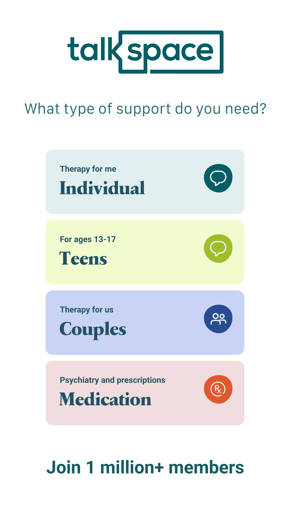 Our subscription service provides high-quality mental health care to anyone ages 13 and up, and has already been used by over 1 million people. See what they have to say at love.talkspace.com.