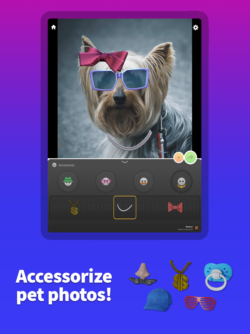 - Add a birthday hat, glasses, moustaches and more to dress your pet for the special occasion.