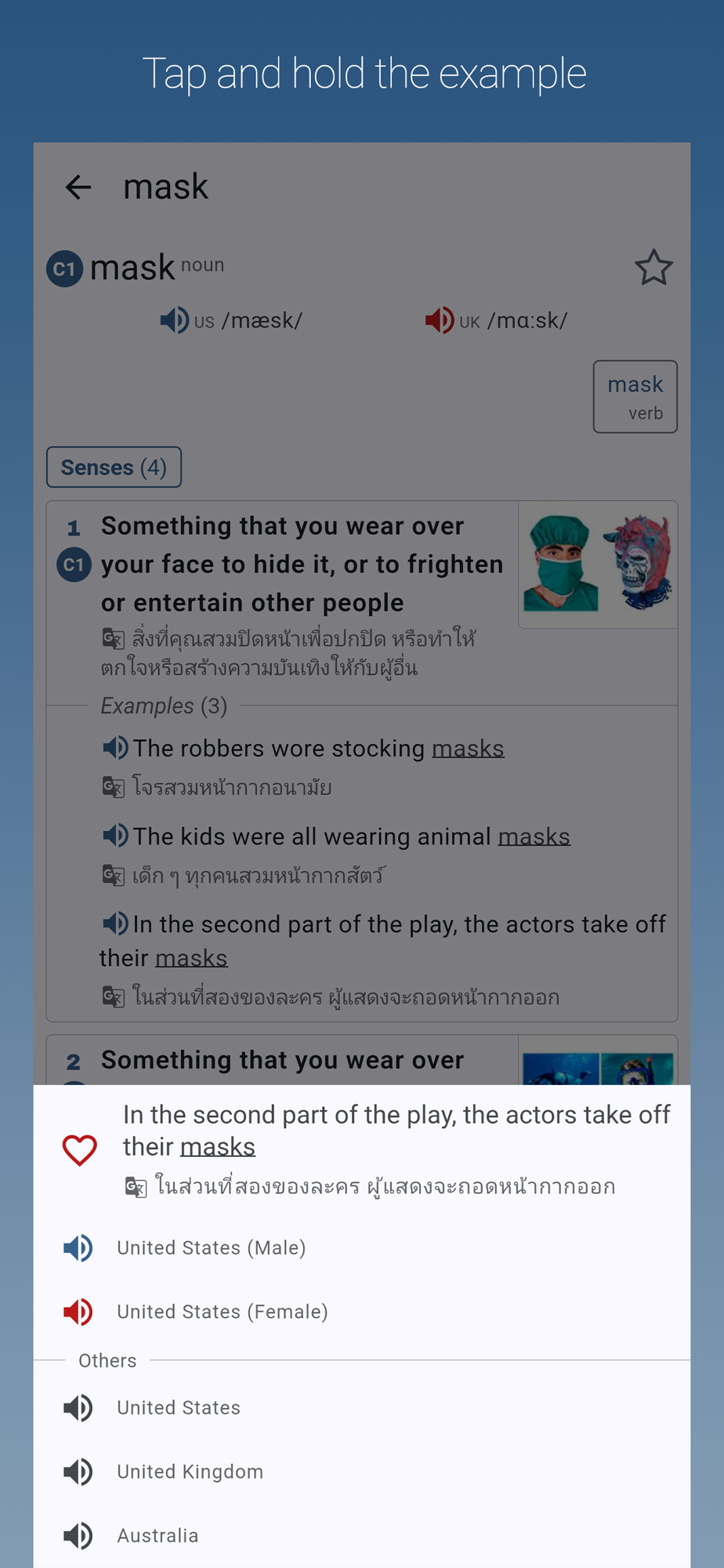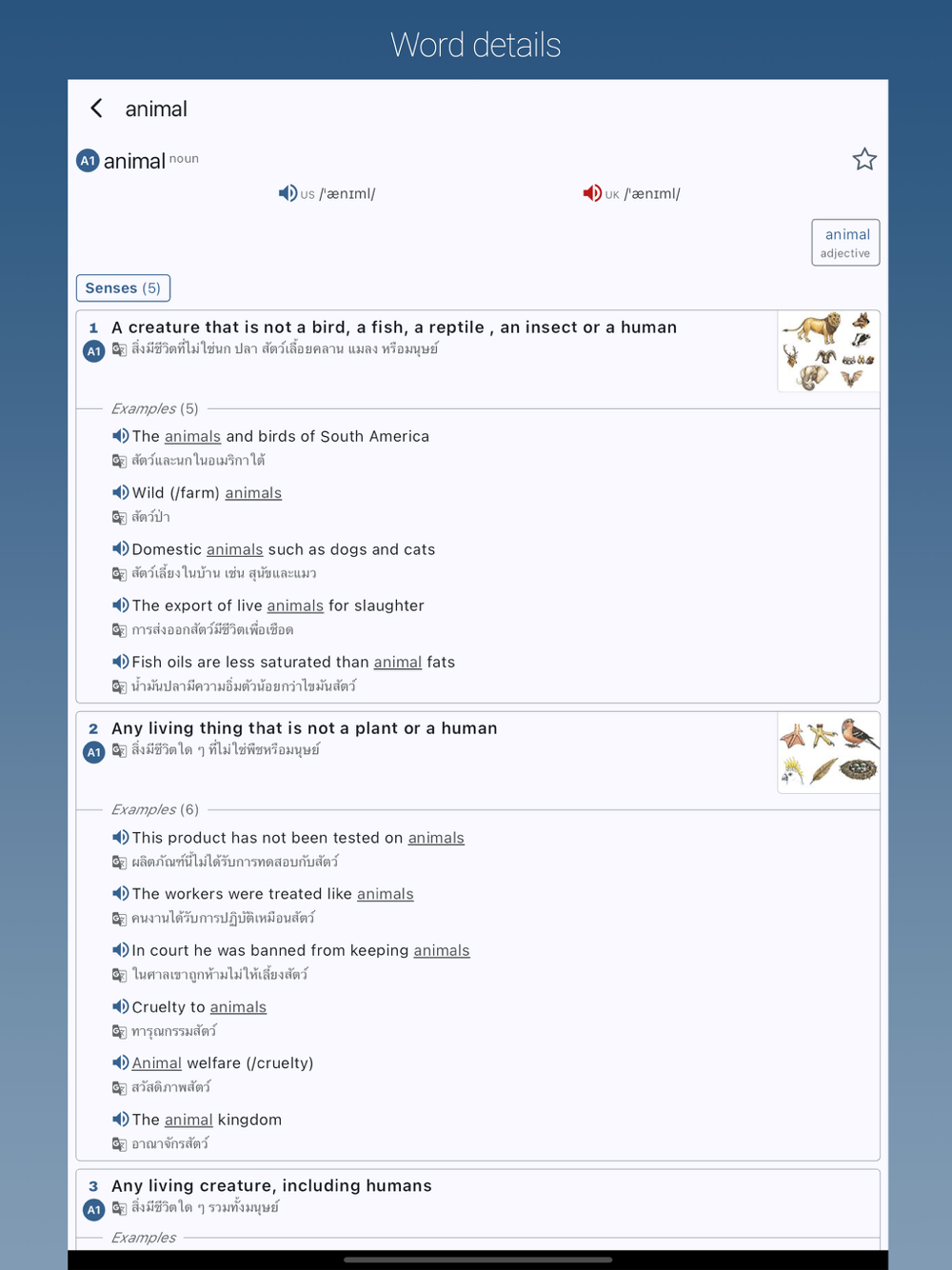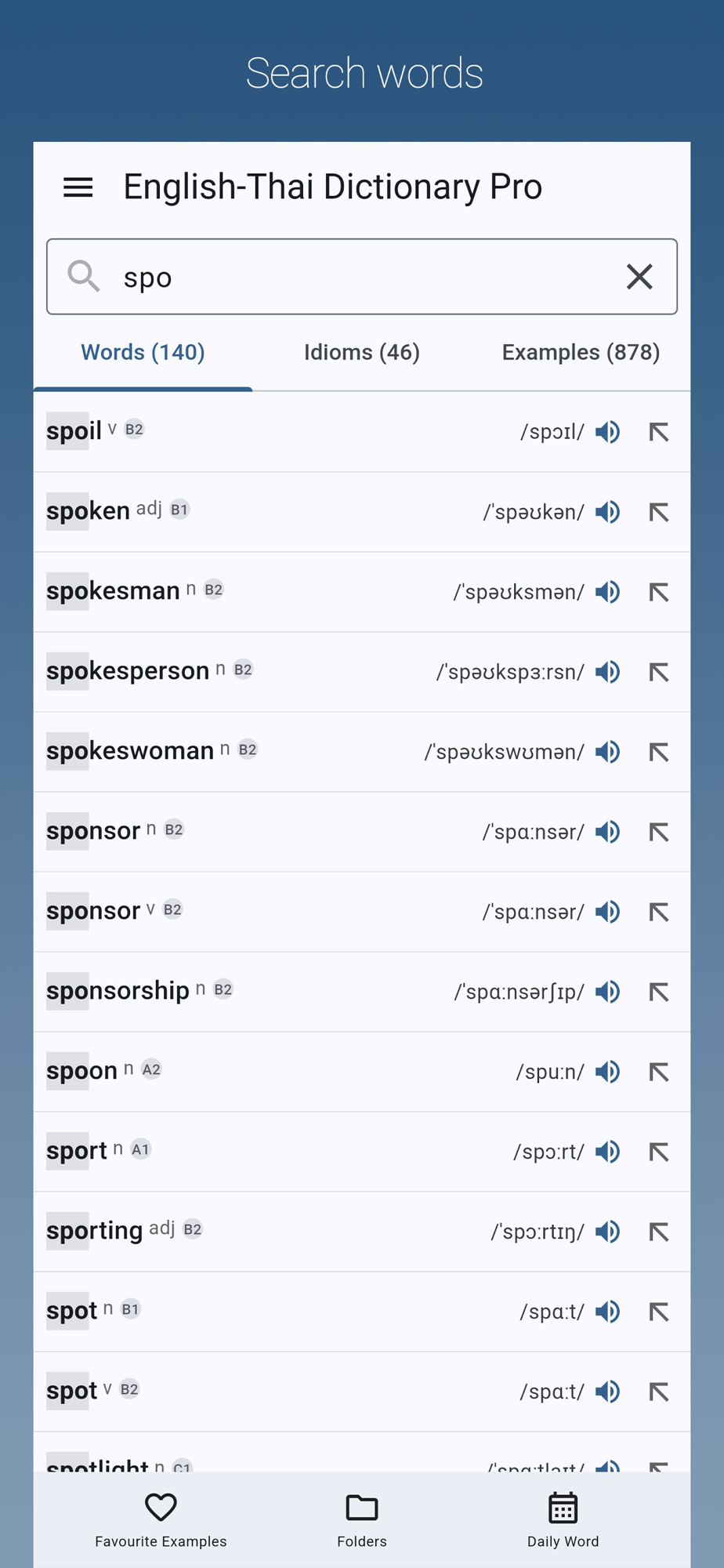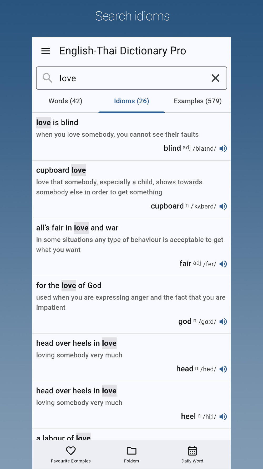Favorite Examples: You can save your favorite examples to view, listen to again, or quickly access the word of each example.