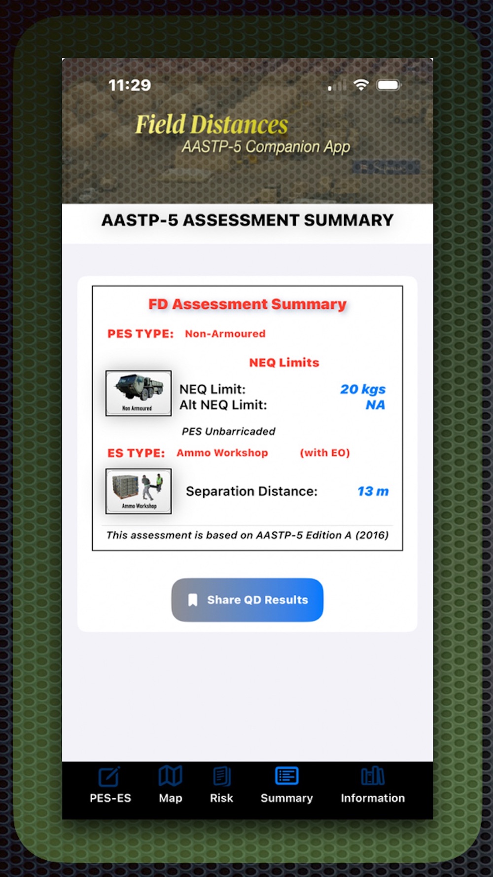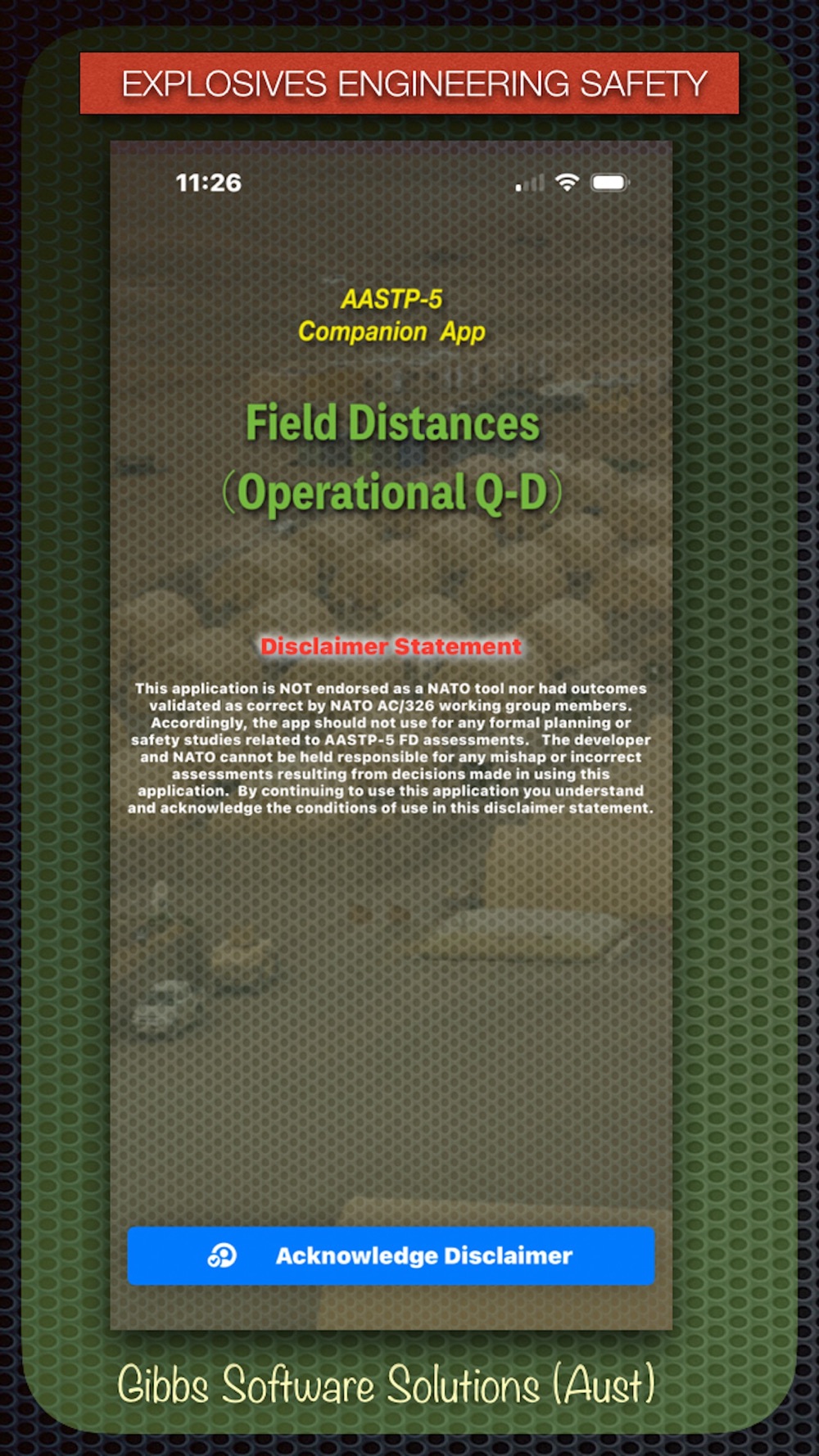 This Companion App has been developed to determine NEQ storage limits for Potential Explosive Sites (PES) based on Field Distance (FD) criteria promulgated in NATO manual AASTP-5, Edition B, Version 1 (2024). The tool primary objective is allow quick one to one PES to ES FD assessments. While permission has been granted to use information contained within AASTP-5, this tool is NOT endorsed by NATO, more specifically, the Group of Experts on the Safety Aspects of Transportation and Storage of Military Ammunition and Explosives (AC/258). For this reason the app should not be used for any formal site planning or FD assessments without validating outcomes with that provided in AASTP-5 and requirements published with your own nation’s regulations. It is also advised that the tool be used with AASTP-5 available to provide clarification and applicability of outcomes generated by this application.