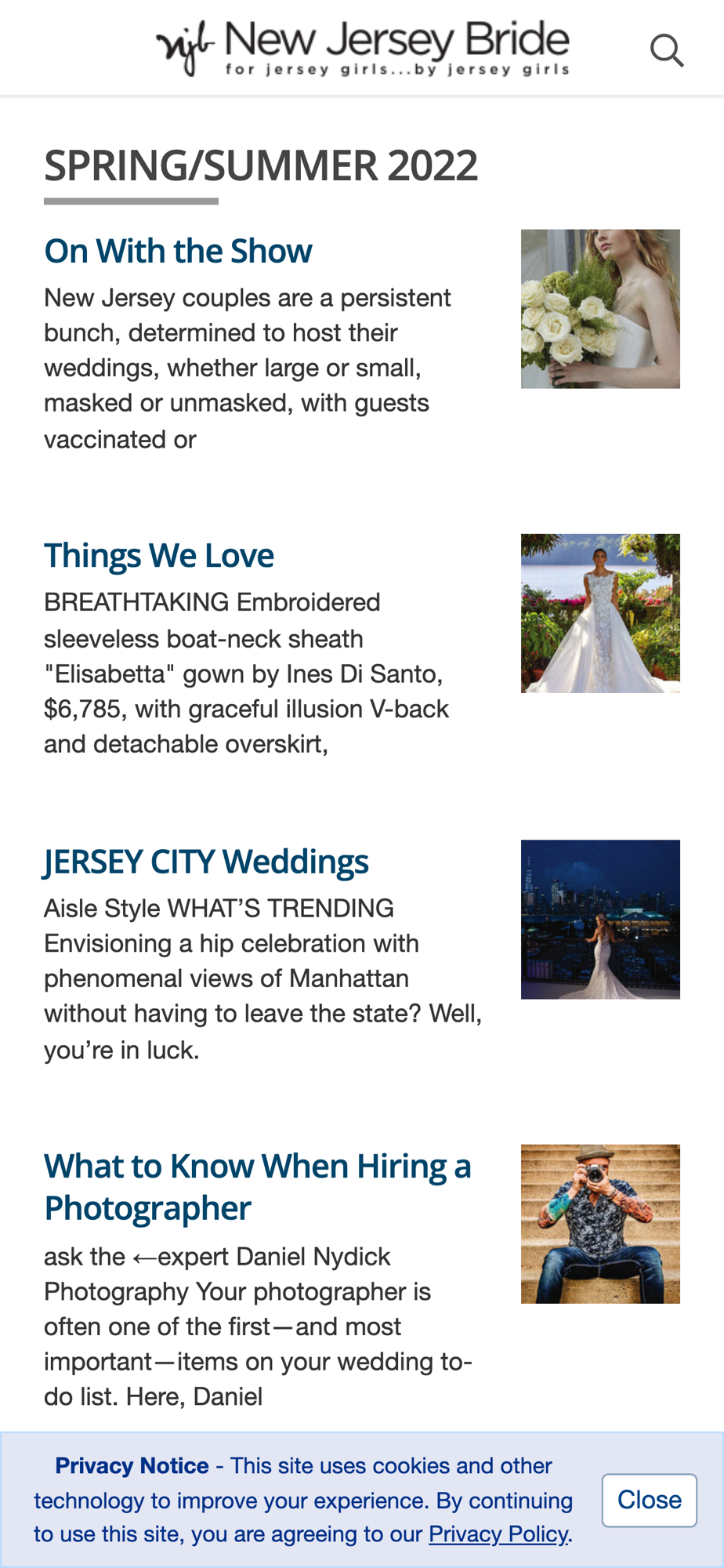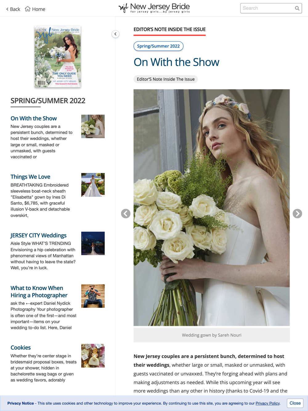 New Jersey Bride provides everything you need to plan your New Jersey wedding. Get expert advice from the complete magazine wherever and whenever you want access. Whether you're looking for a location, photographer, bridal gown, band, invitations, flowers, catering, rings, cakes, wedding planner or any of the other special details needed to complete your big day, we’ve got you covered. New Jersey Bride is the go-to source for brides on the go.