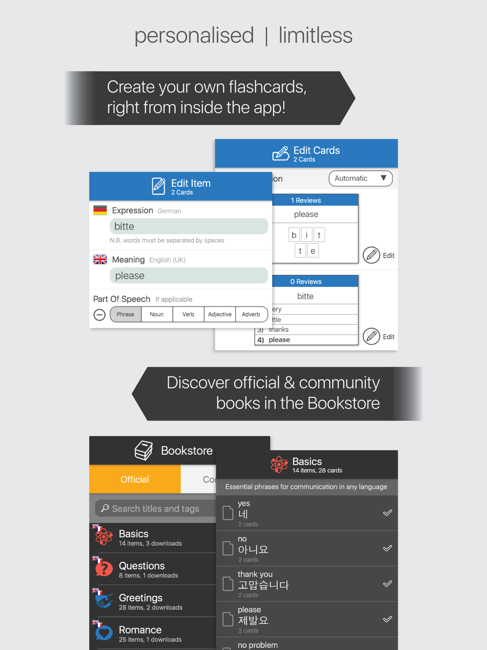 - Create your own, or discover official and community created books of interactive flashcards.