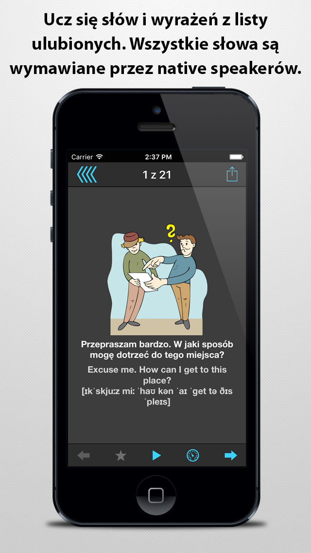 Ta darmowa aplikacja jest mówiącymi, ilustrowanymi rozmówkami, które tłumaczą około 300 najczęściej używanych polskich słów i wyrażeń na 34 języki. To daje unikalną możliwość komunikacji za granicą bez żadnych umiejętności językowych, gdyż aplikacja w prosty sposób wypowiada upragnione, przetłumaczone wyrażenie. Łatwe w zrozumieniu ilustracje czynią komunikację jeszcze prostszą.
