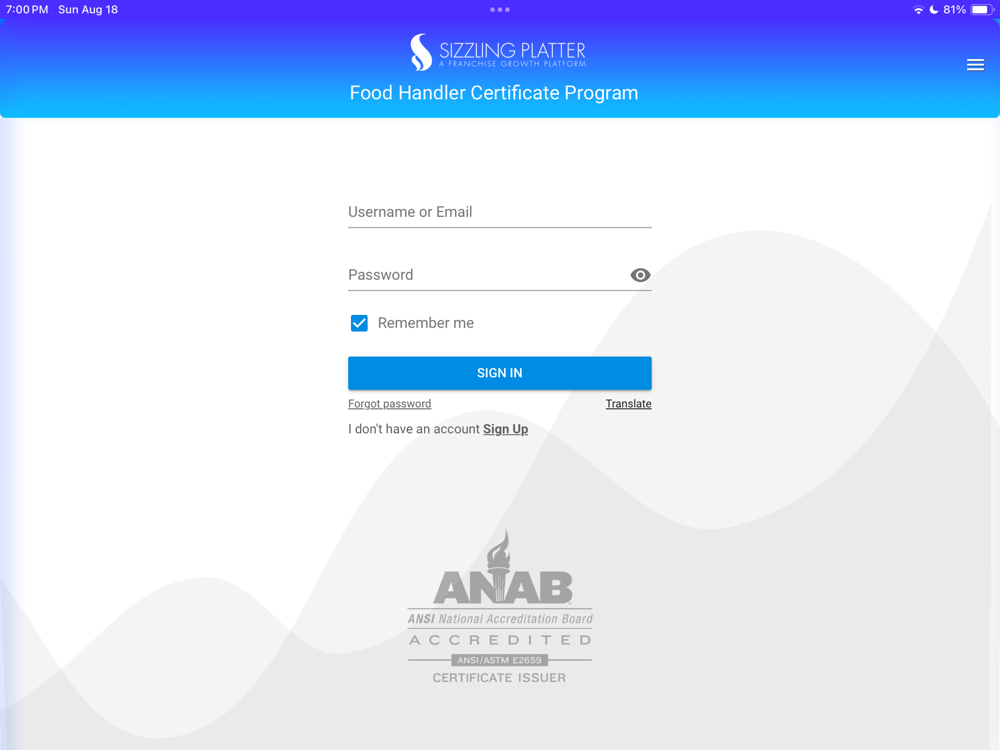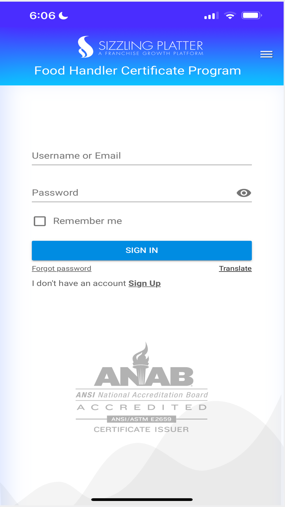 The Safe Food Handler certificate program is an ANAB-accredited program (Accreditation ID 1243) published by Cogneti LLC. The program is self-guided, allows unlimited exam attempts, and is designed for easy, anytime use as a mobile application.