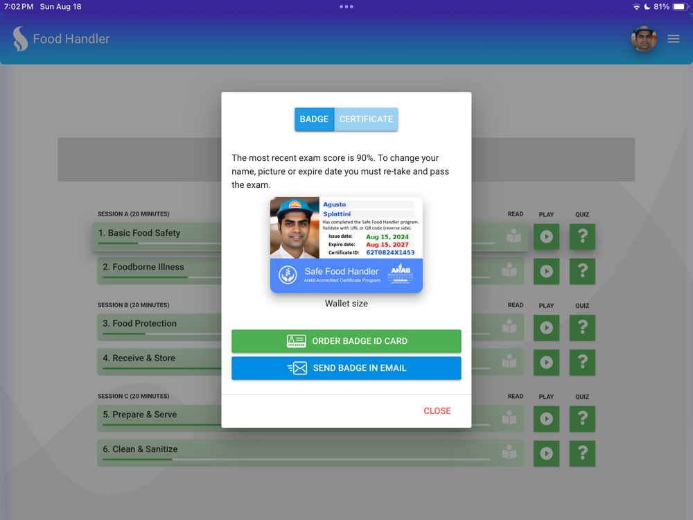 The purpose of this certificate program is to instruct, assess, and issue FOOD HANDLER cards (badges) and certificates accepted by: