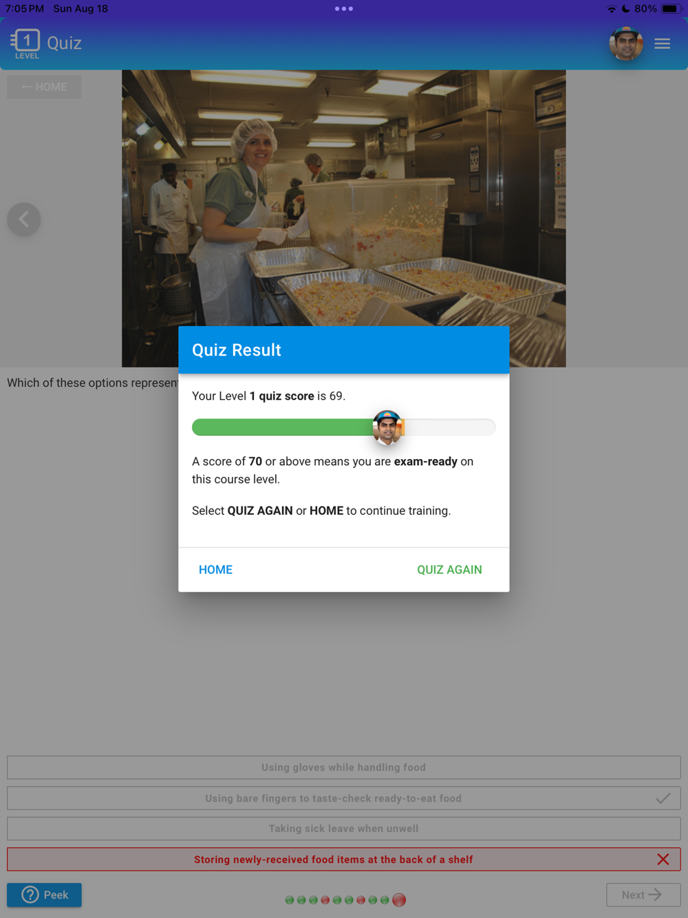 4. Once you have read and quizzed at all seven levels the EXAM is available for you to attempt. Pass the exam with at least a 70% score. If you do not pass an exam, the app will show where you need to study by marking that level in red. You must complete additional quizzes on that level before the exam will unlock for another attempt. We’ll also send you an email detailing your exam performance.